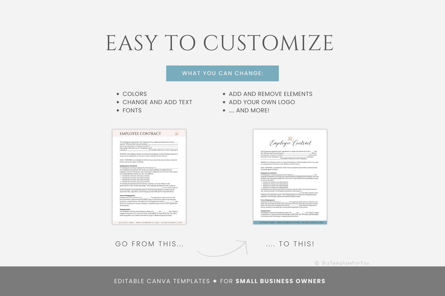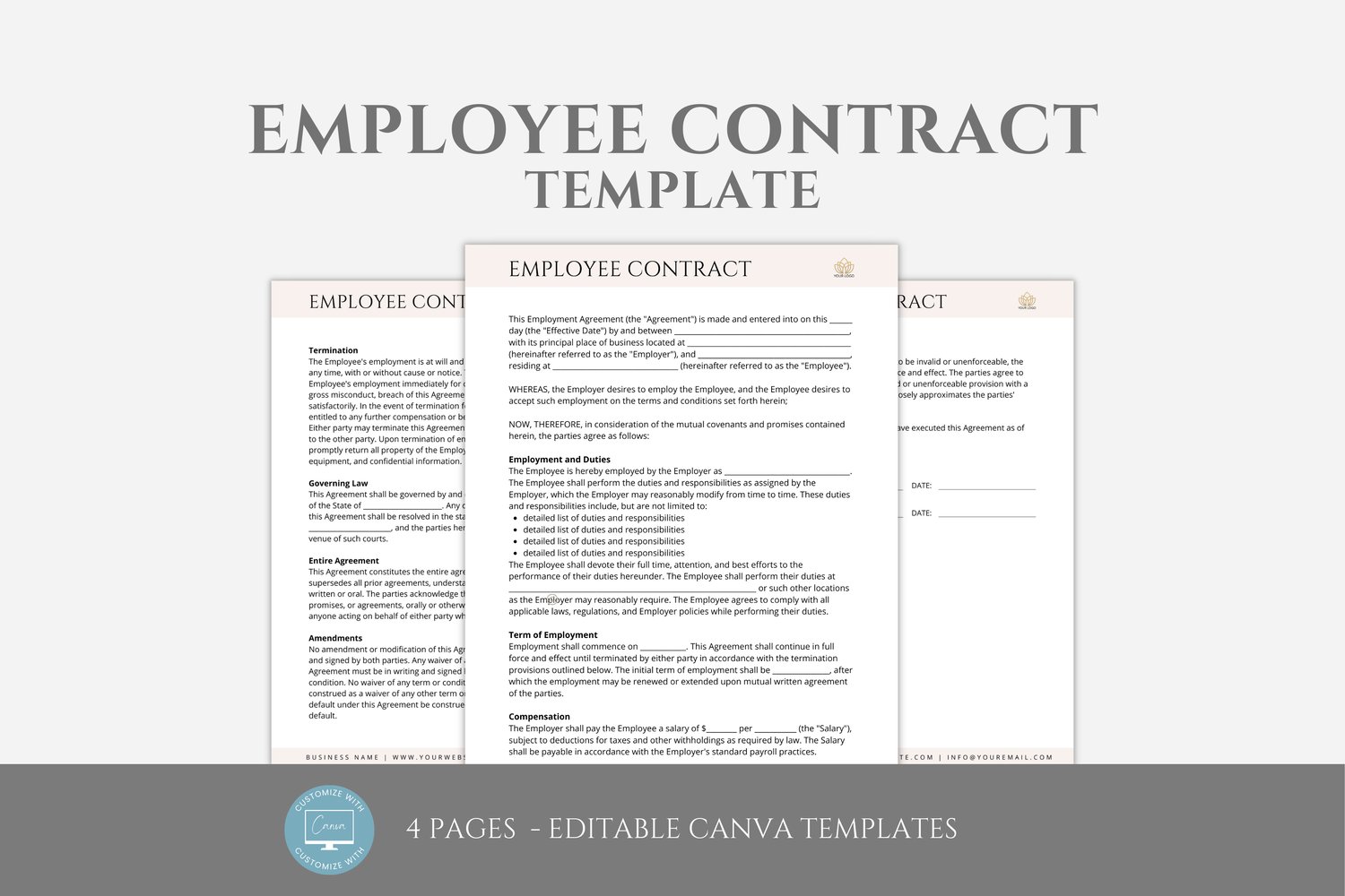 This is a 4-page Employee Contract Template editable in Canva (FREE Account)! The text is already written for you, but it is also easily edited in CANVA to add anything that is particular to your business or area. It is also completely customizable. Text, font, and colors are all fully editable to give you complete control of your branding and create a cohesive look for your business.