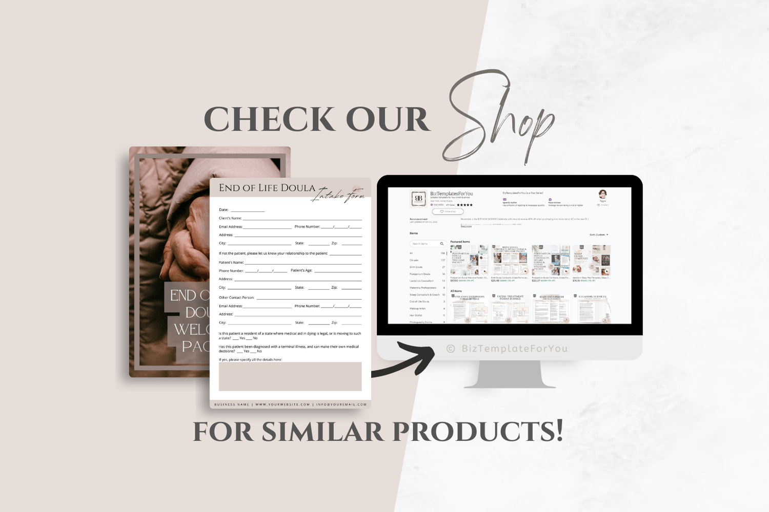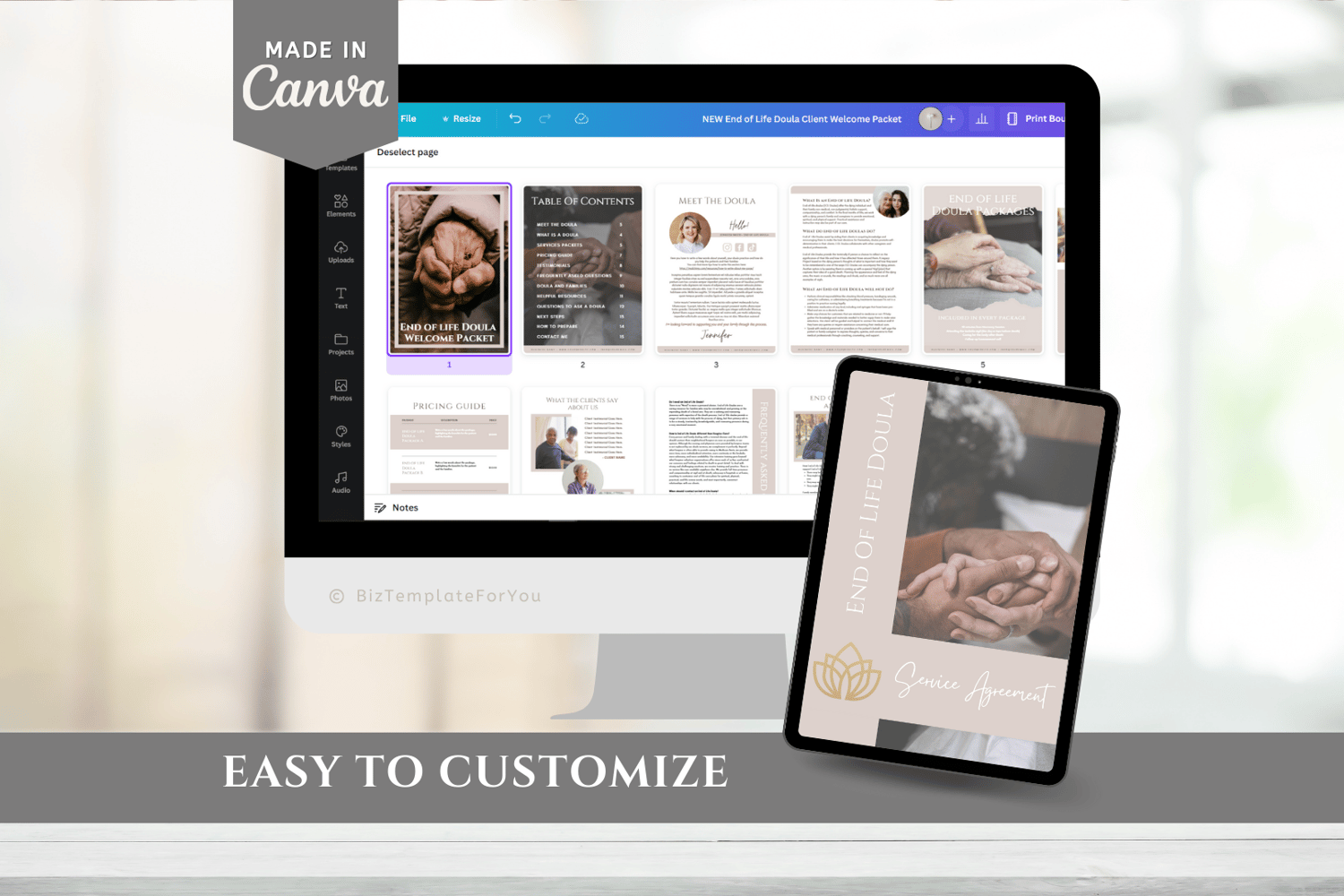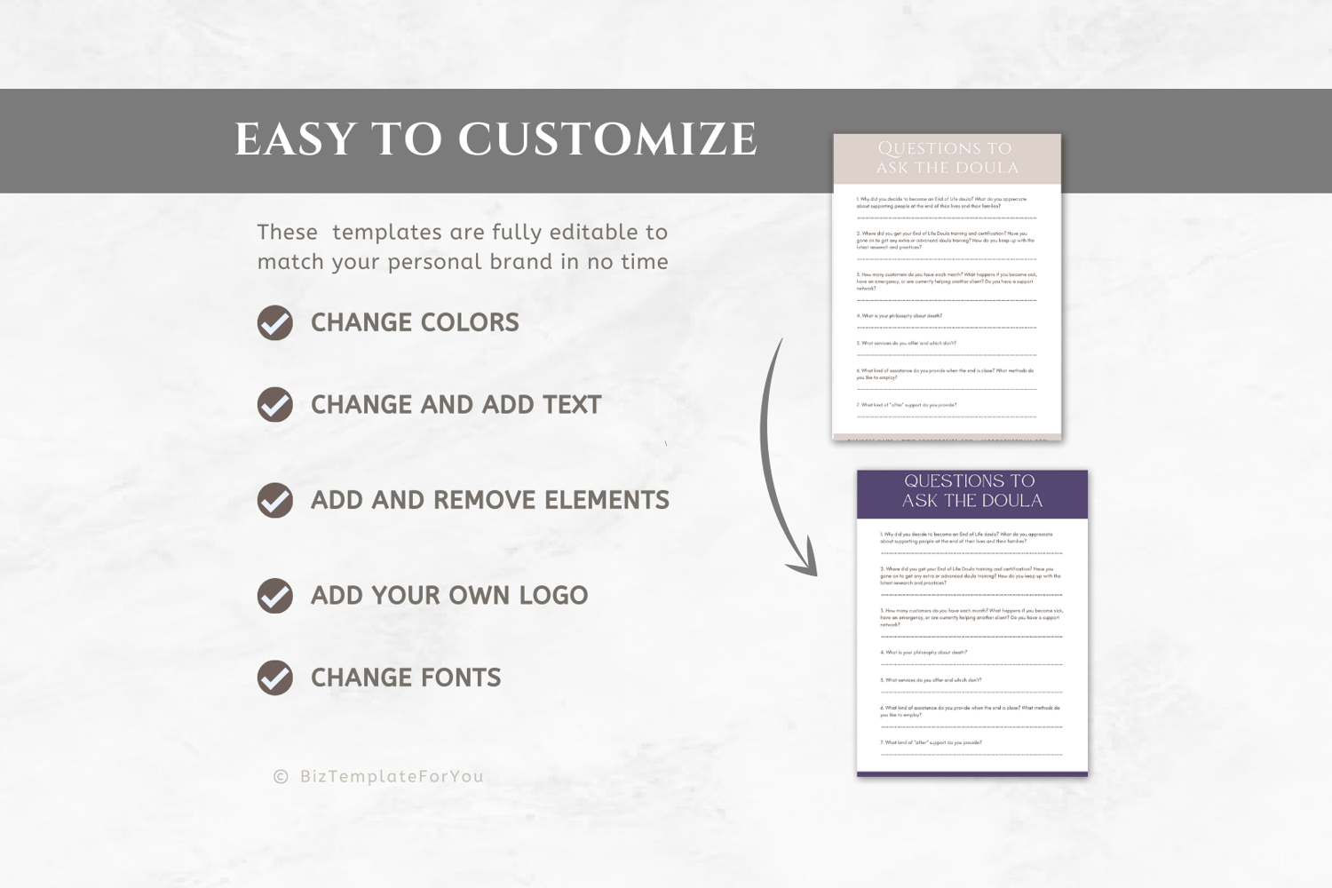 This is a 31-page End of Life Doula Paperwork Template Bundle, editable in Canva (FREE Account)! The text is already written for you but it is also easily edited in CANVA to add anything that is particular to your business or area it is also completely customizable. Text, font, and colors are all fully editable to give you complete control of your branding and create a cohesive look for your business.
