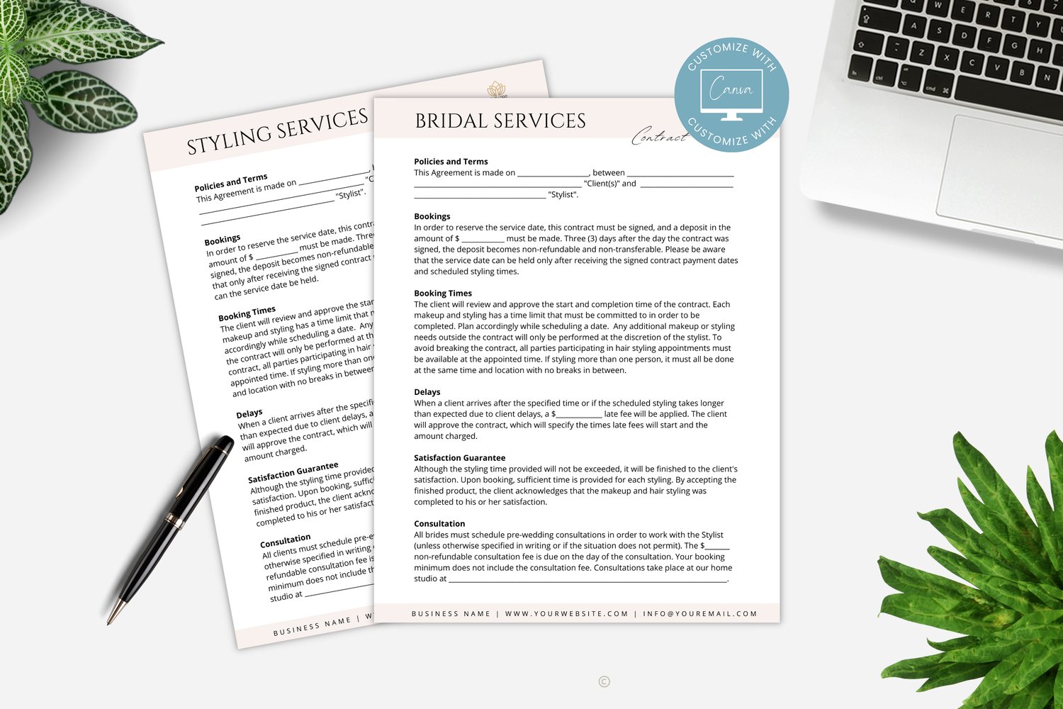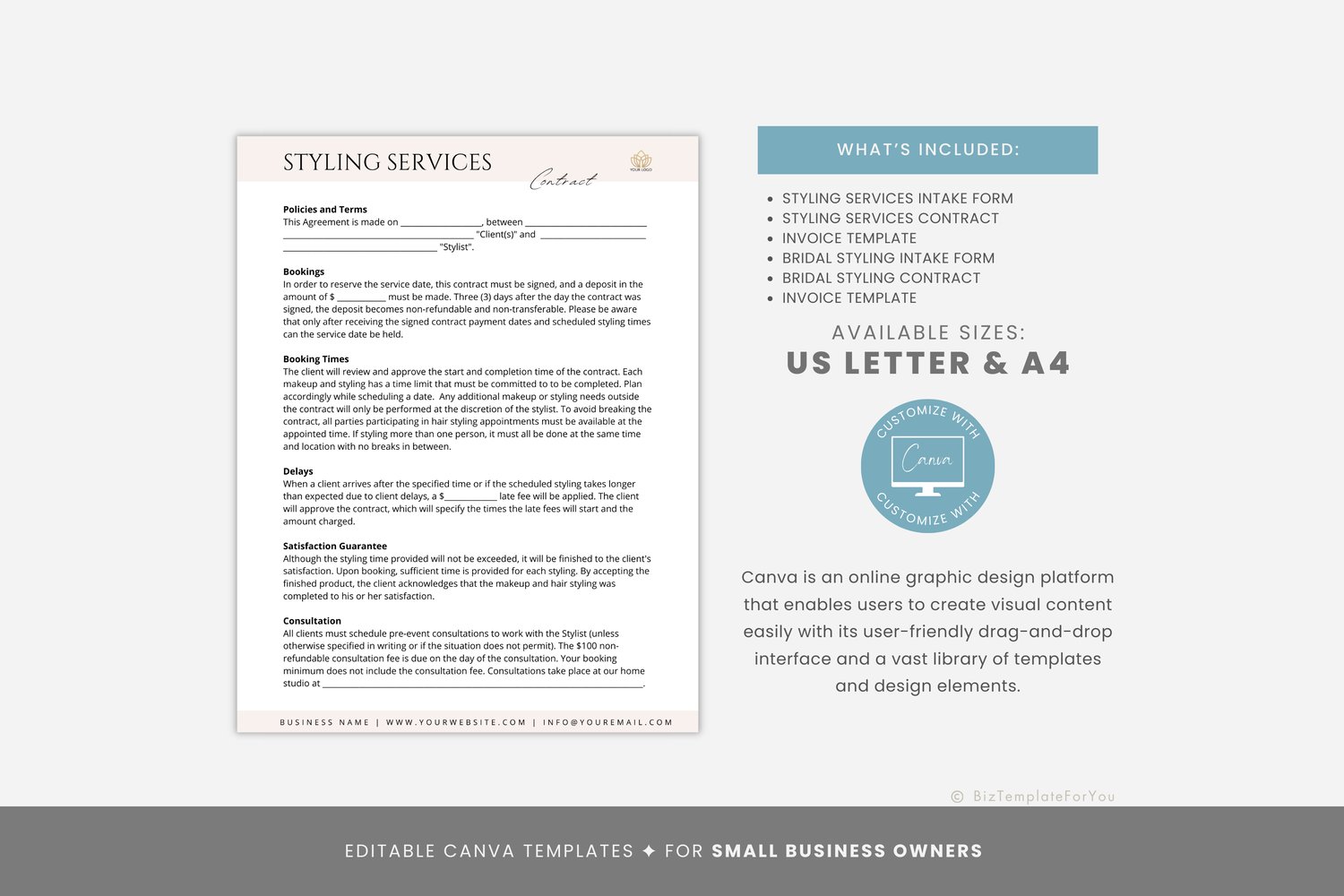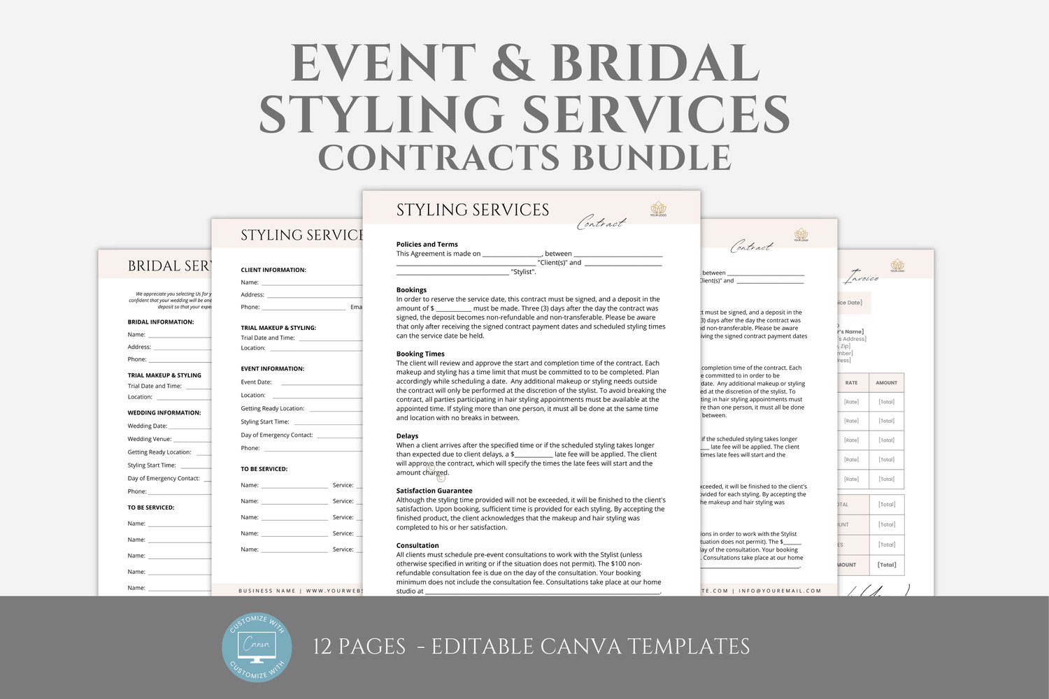 Editable Event and Bridal Styling Services Contract Template Bundle, incl. Intake and Invoice Templates, Freelance Styling Artists, Canva editable #2024