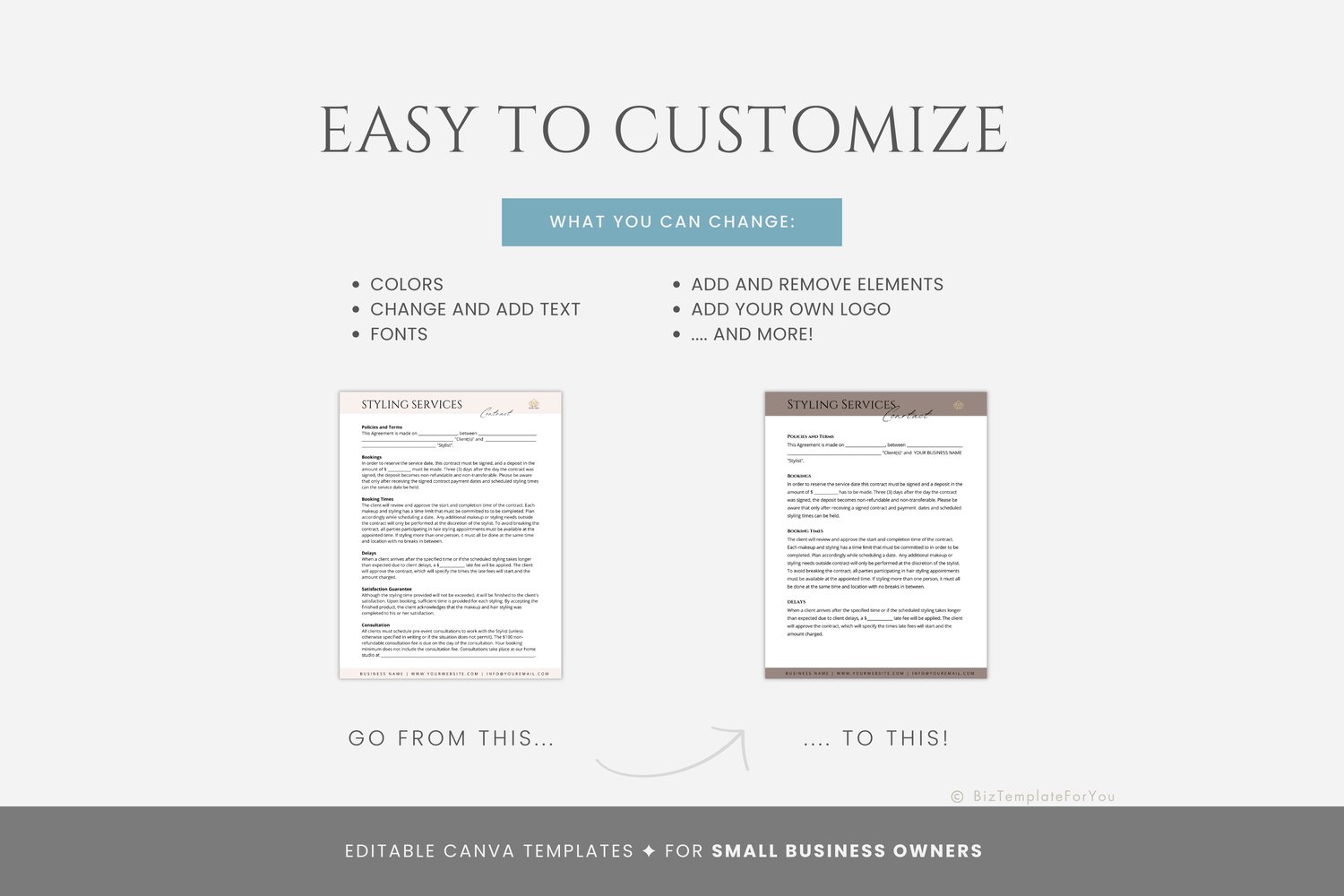 This is a 12-page Makeup & Hairstyling Services Contract Template bundle editable in Canva (FREE Account)! The text is already written for you, but it is also easily edited in CANVA to add anything particular to your business or area. It is also completely customizable. Text, font, and colors are all fully editable to give you complete control of your branding and create a cohesive look for your business.
