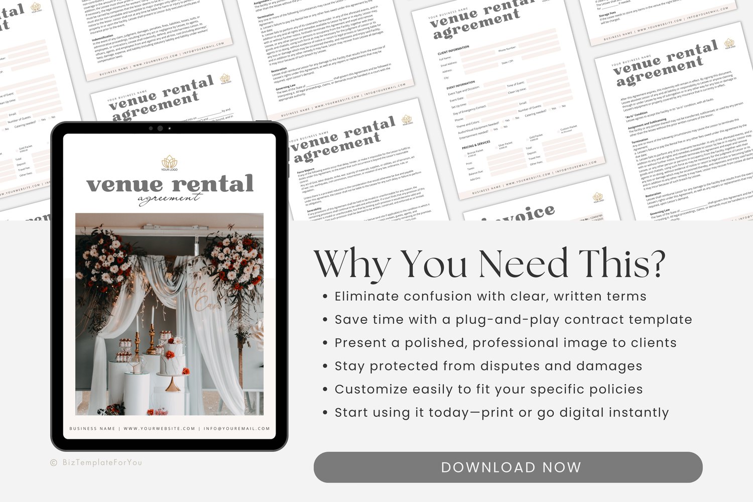 👉 Don’t risk confusion or miscommunication when booking your venue. Download this editable Venue Rental Agreement Template now and create confident, organized bookings in minutes.