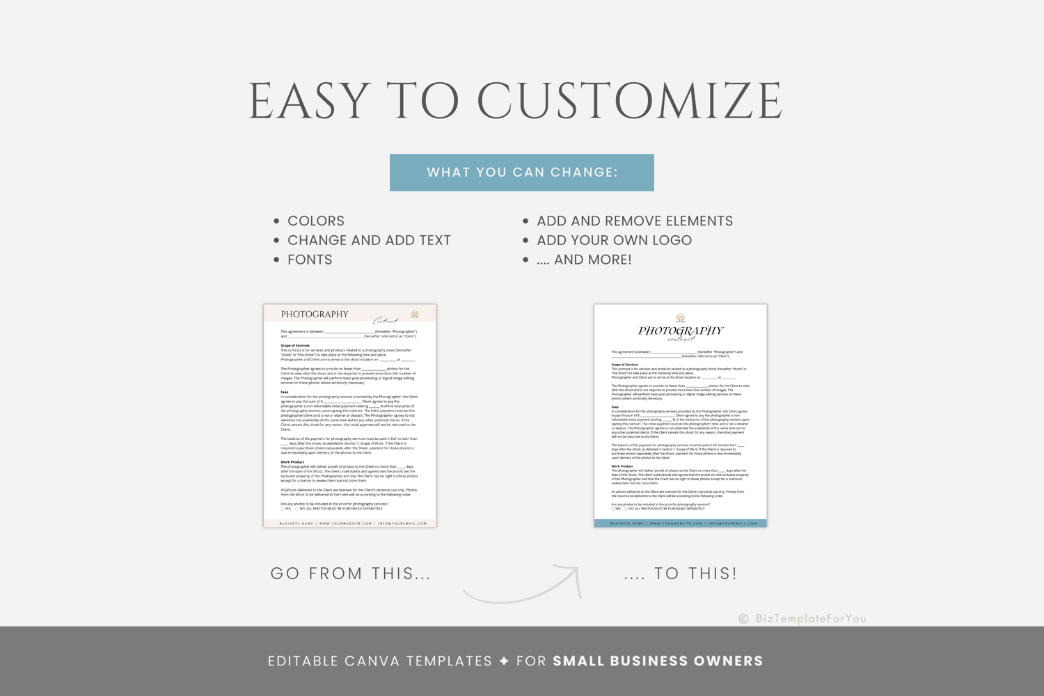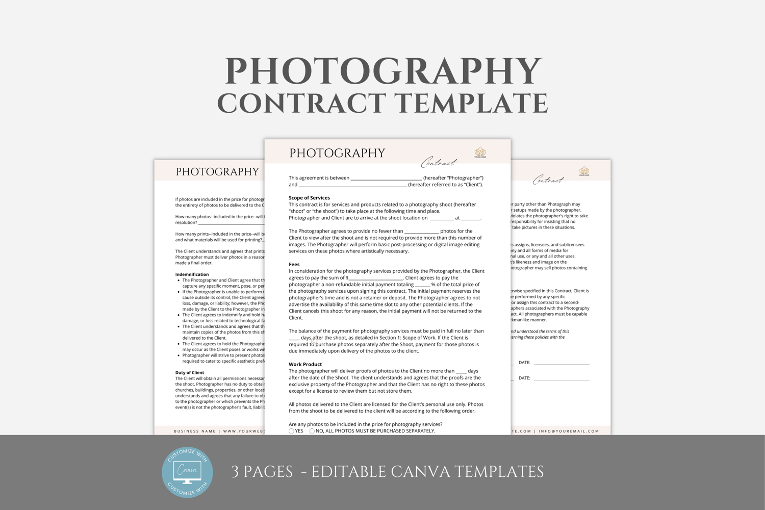 This is a 3-page Photography Contract Template editable in Canva (FREE Account)! The text is already written for you, but it is also easily edited in CANVA to add anything particular to your business or area. It is also completely customizable. Text, font, and colors are all fully editable to give you complete control of your branding and create a cohesive look for your business.