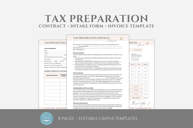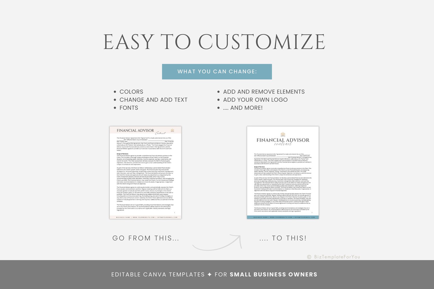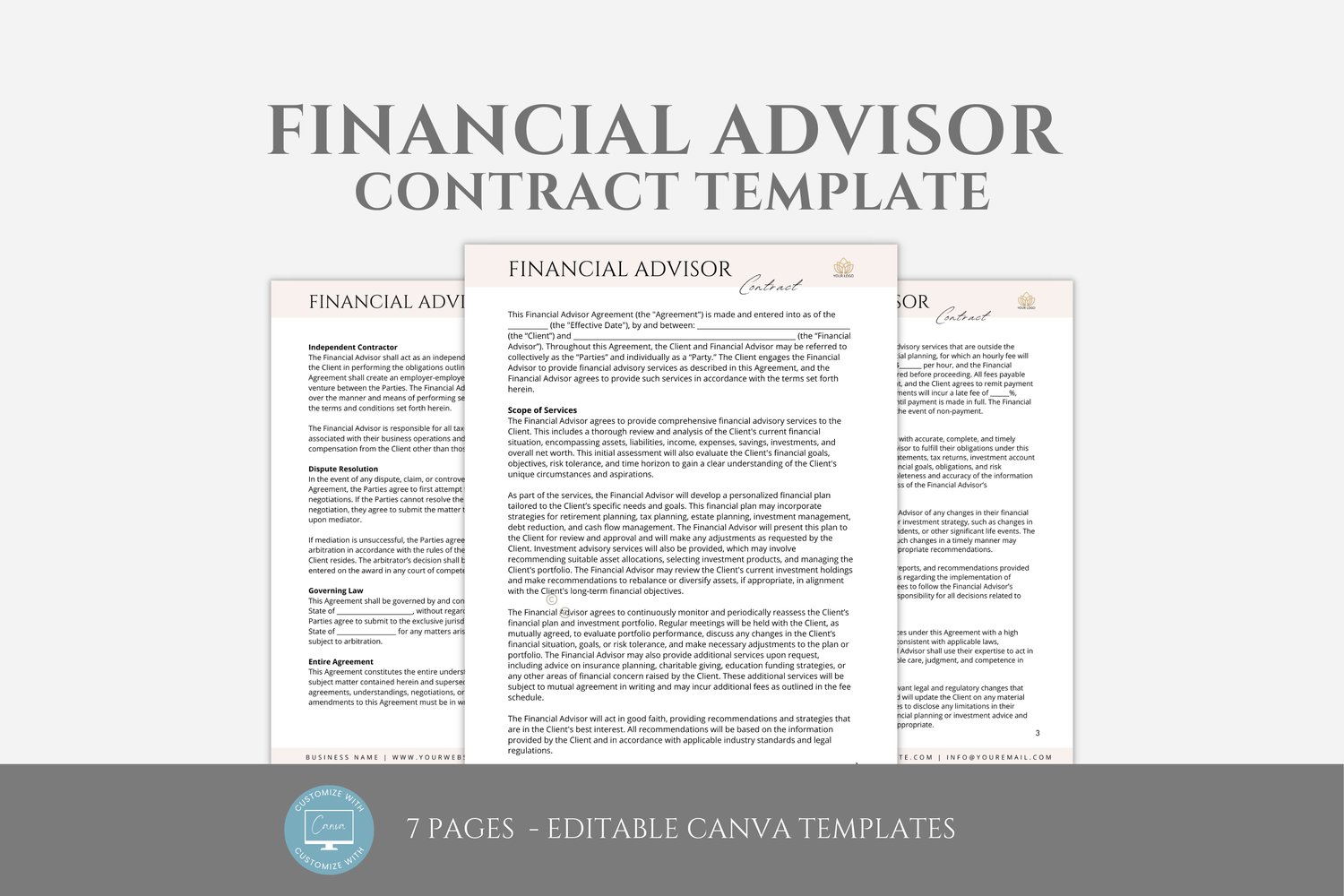 This is a 7-page Financial Advisor Contract Template editable in Canva (FREE Account)! The text is already written for you, but it can be easily edited in CANVA to add anything particular to your business or area. It is also completely customizable. Text, font, and colors are all fully editable to give you complete control of your branding and create a cohesive look for your business.