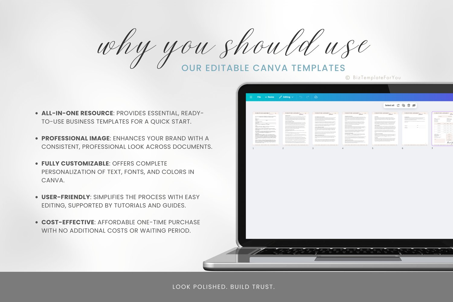 + All elements of our templates are FREE. BizTemplateForYou bears no responsibility for situations wherein the client utilizes PRO elements within Canva, resulting in charges incurred by Canva.