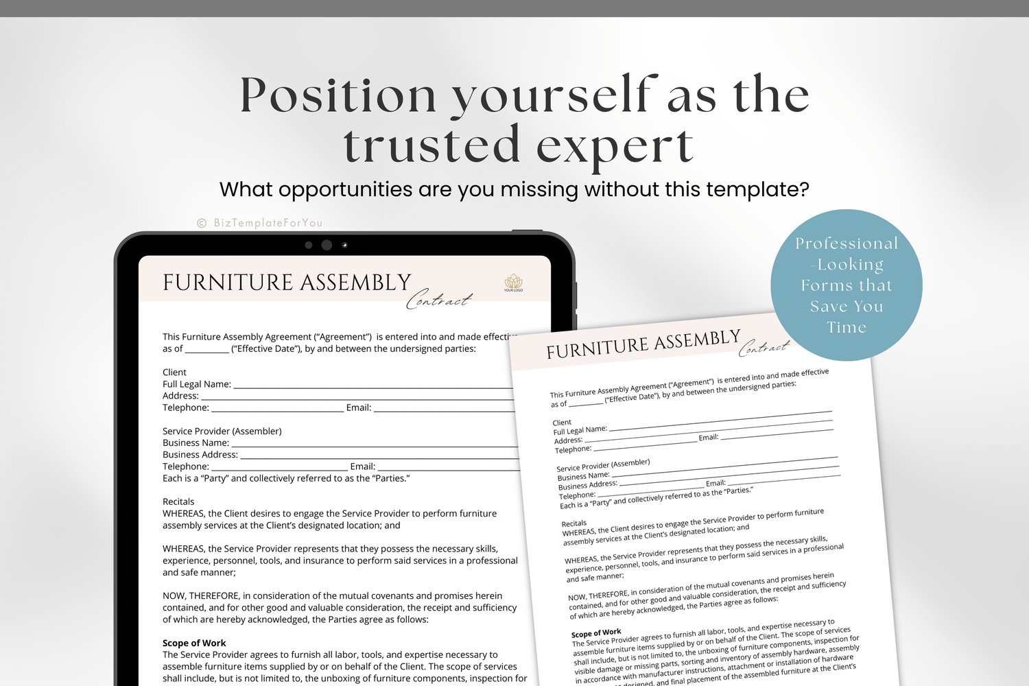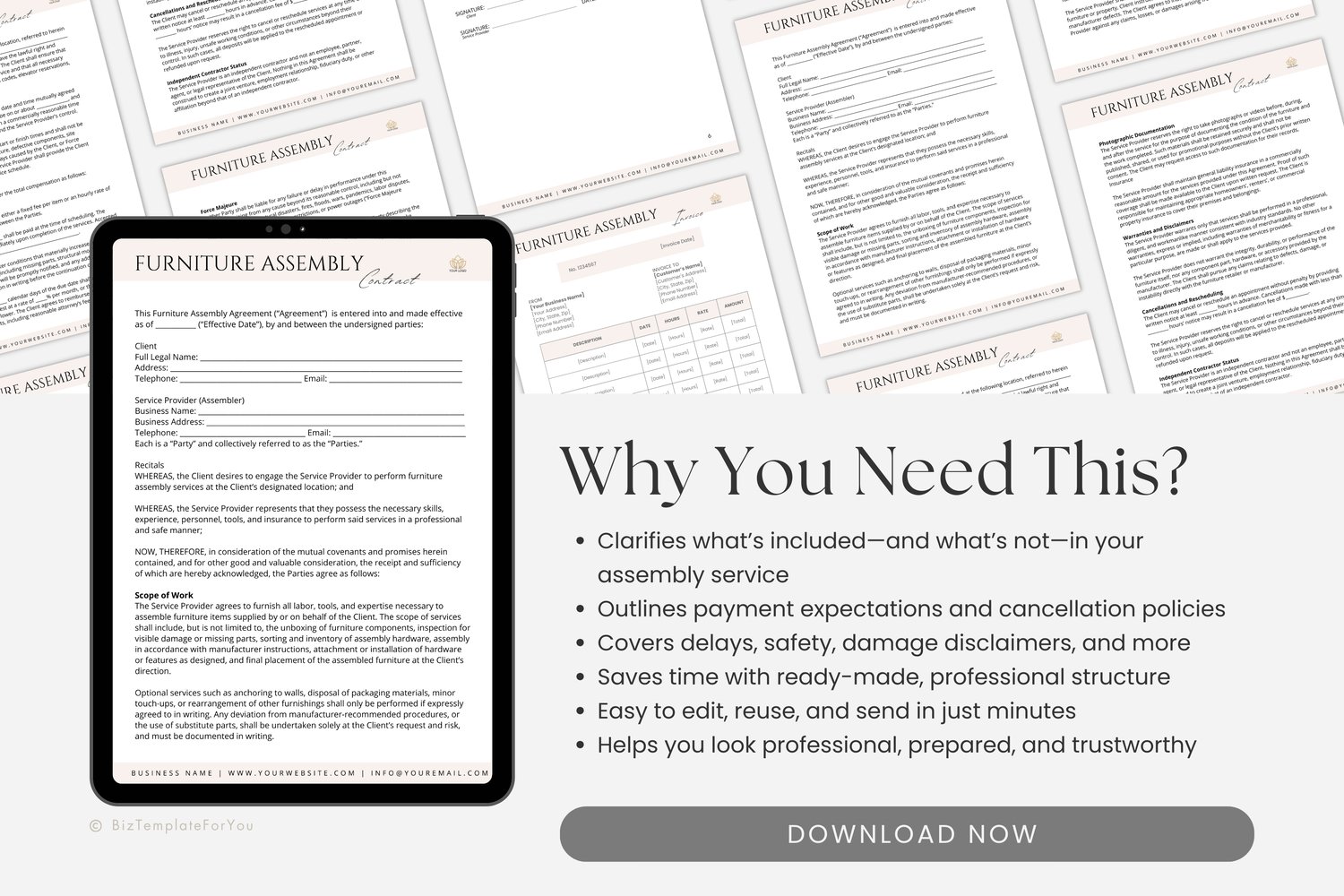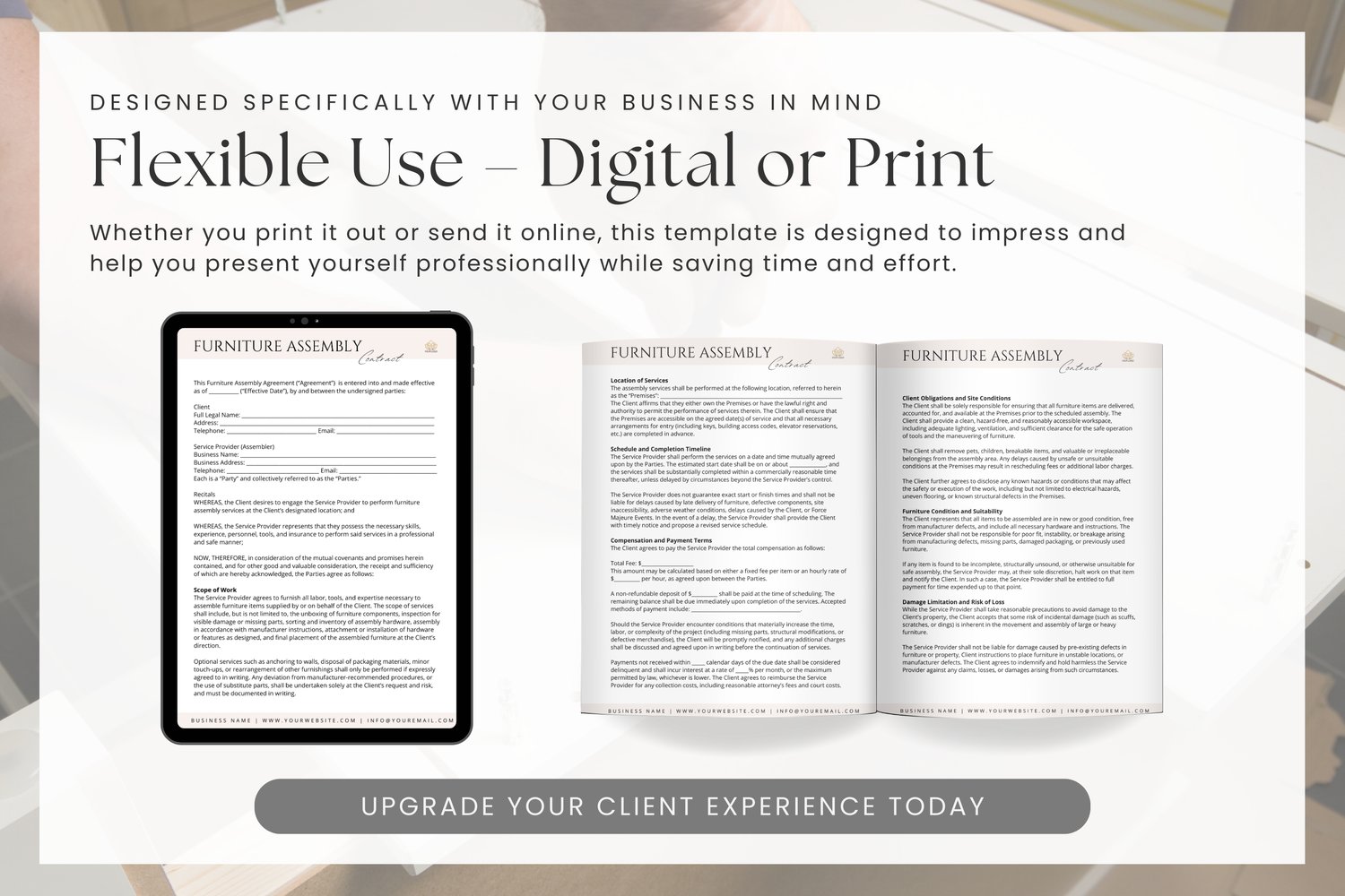 👉 Stop scrambling for last-minute paperwork or hoping clients “get it.” Download this Furniture Assembly Contract Template now and make every job clear, confident, and legally secure—starting today!