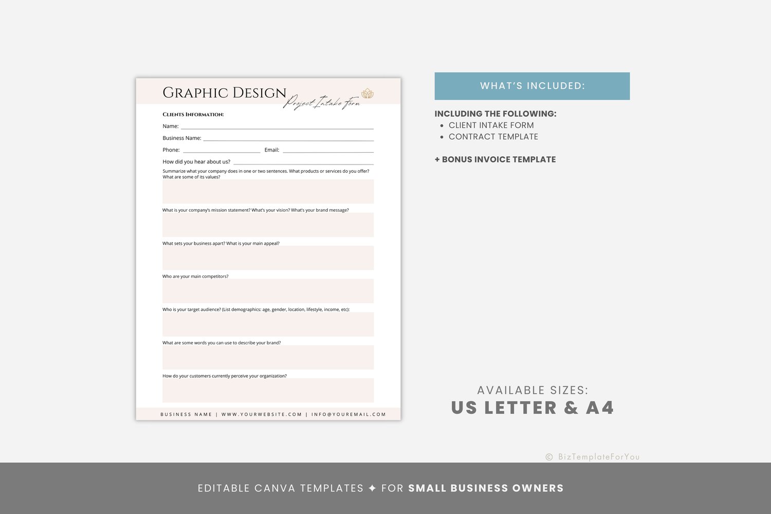 All of the files included in this download are original and copyrighted by Biz Templates For You. Files are for personal use only and may not be resold, copied, distributed, or shared with a third party. ©BIZ TEMPLATES FOR YOU