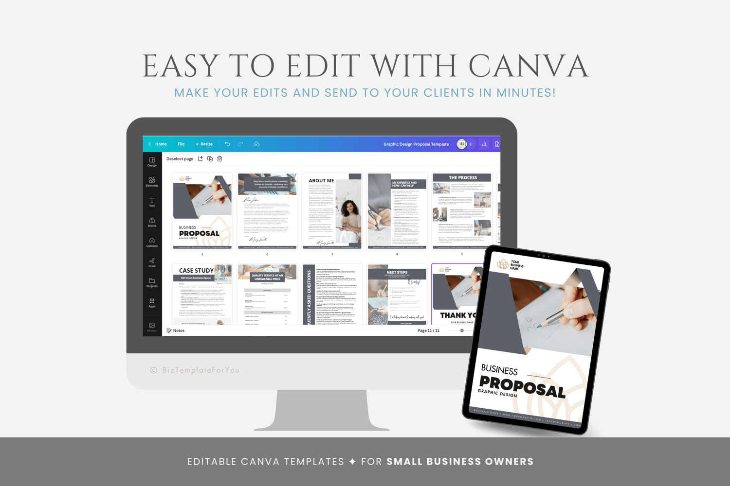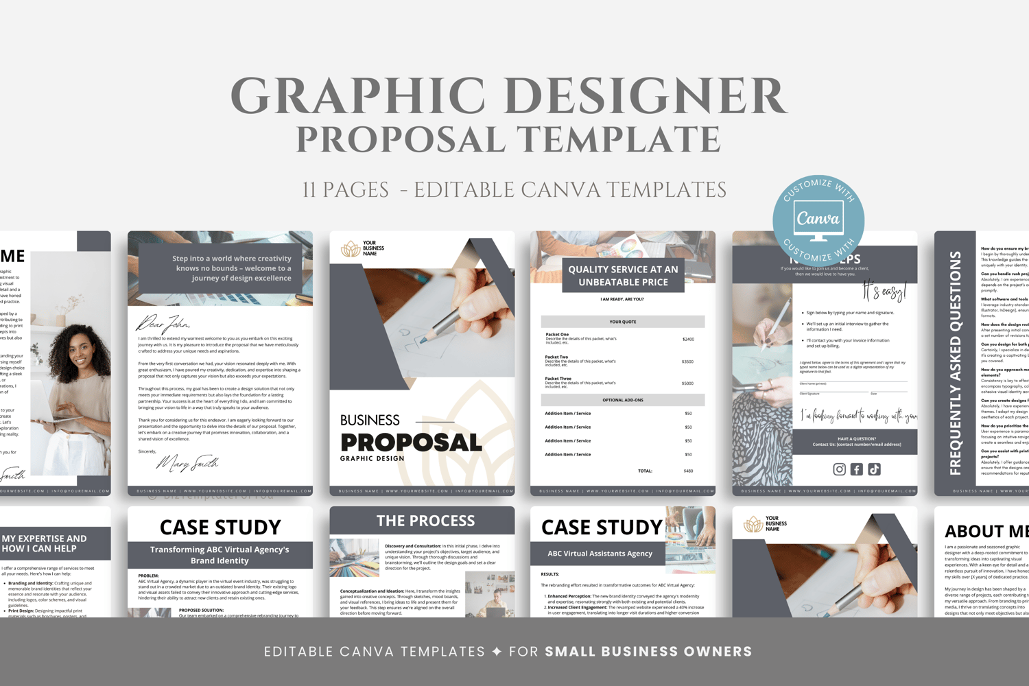 This is an 11-page Graphic Design Proposal Template editable in Canva (FREE Account)! The text is already written for you, but it is also easily edited in CANVA to add anything that is particular to your business or area. It is also completely customizable. Text, font, and colors are all fully editable to give you complete control of your branding and create a cohesive look for your business.
