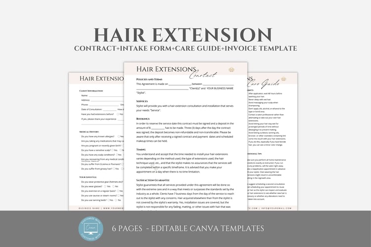This is a 6-page Hair Styling Contract Template bundle editable in Canva (FREE Account)! The text is already written for you, but it is also easily edited in CANVA to add anything particular to your business or area. It is also completely customizable. Text, font, and colors are all fully editable to give you complete control of your branding and create a cohesive look for your business.