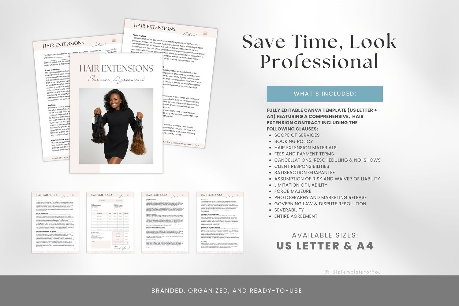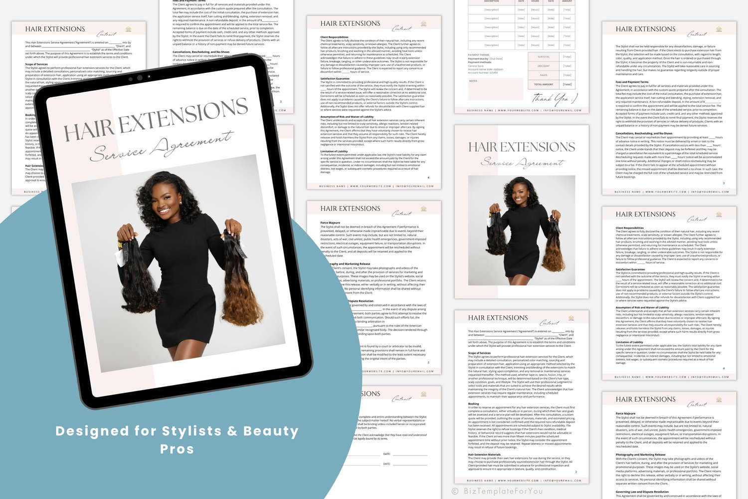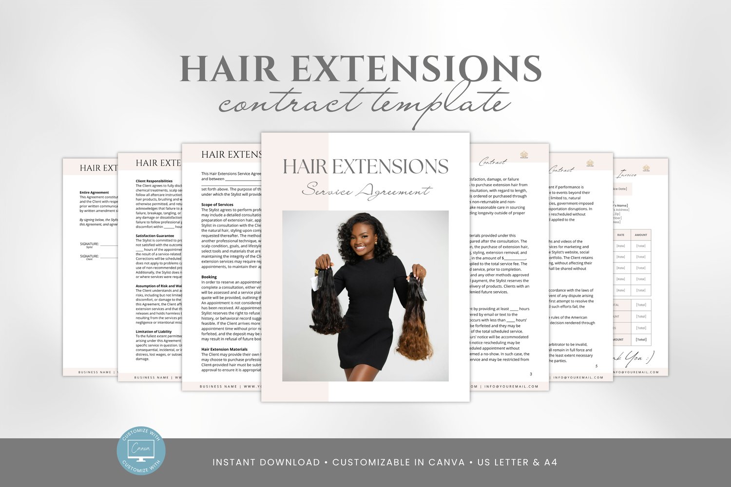 A fully editable Canva template (US Letter + A4) featuring a comprehensive Hair Extension Contract including the following clauses:
