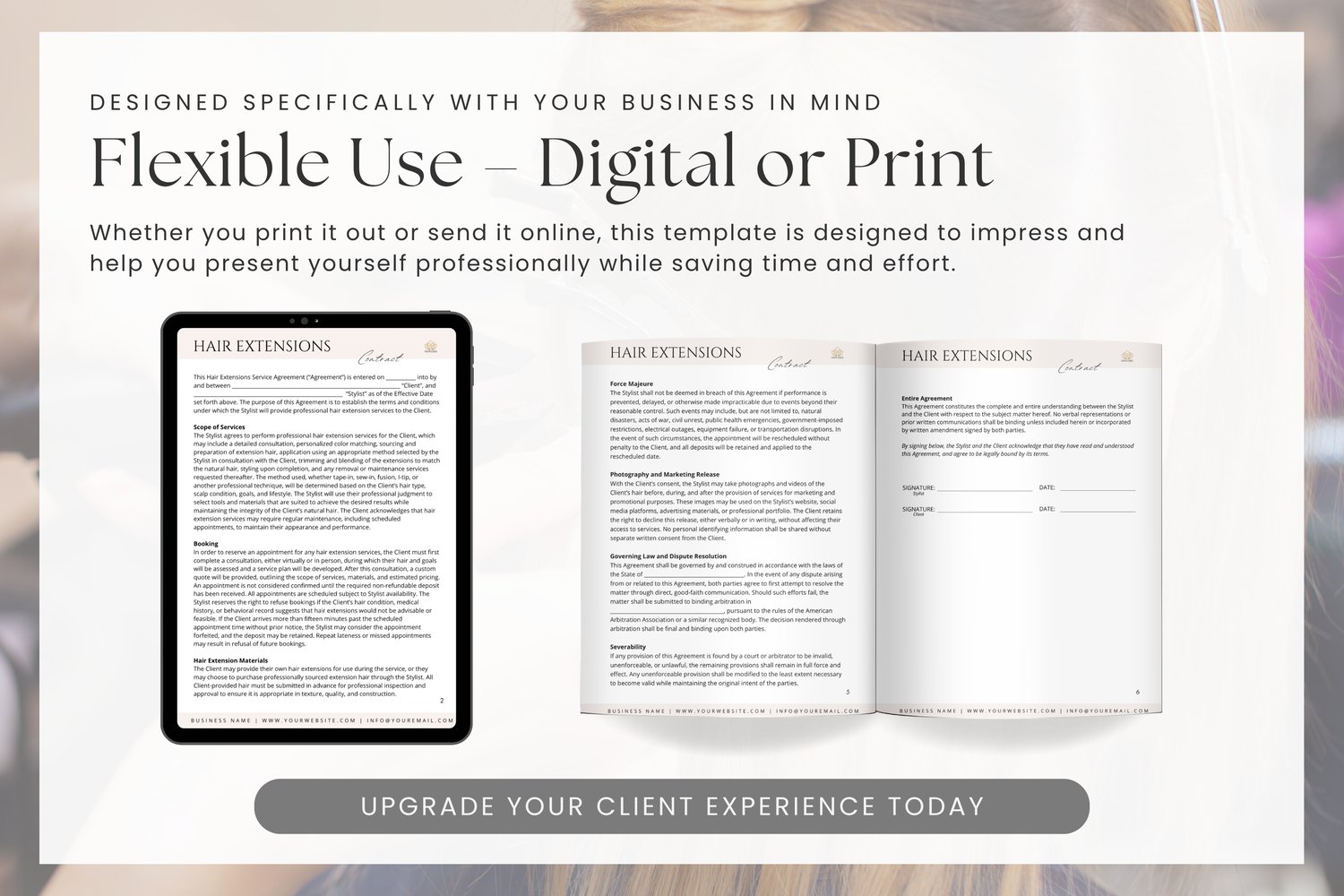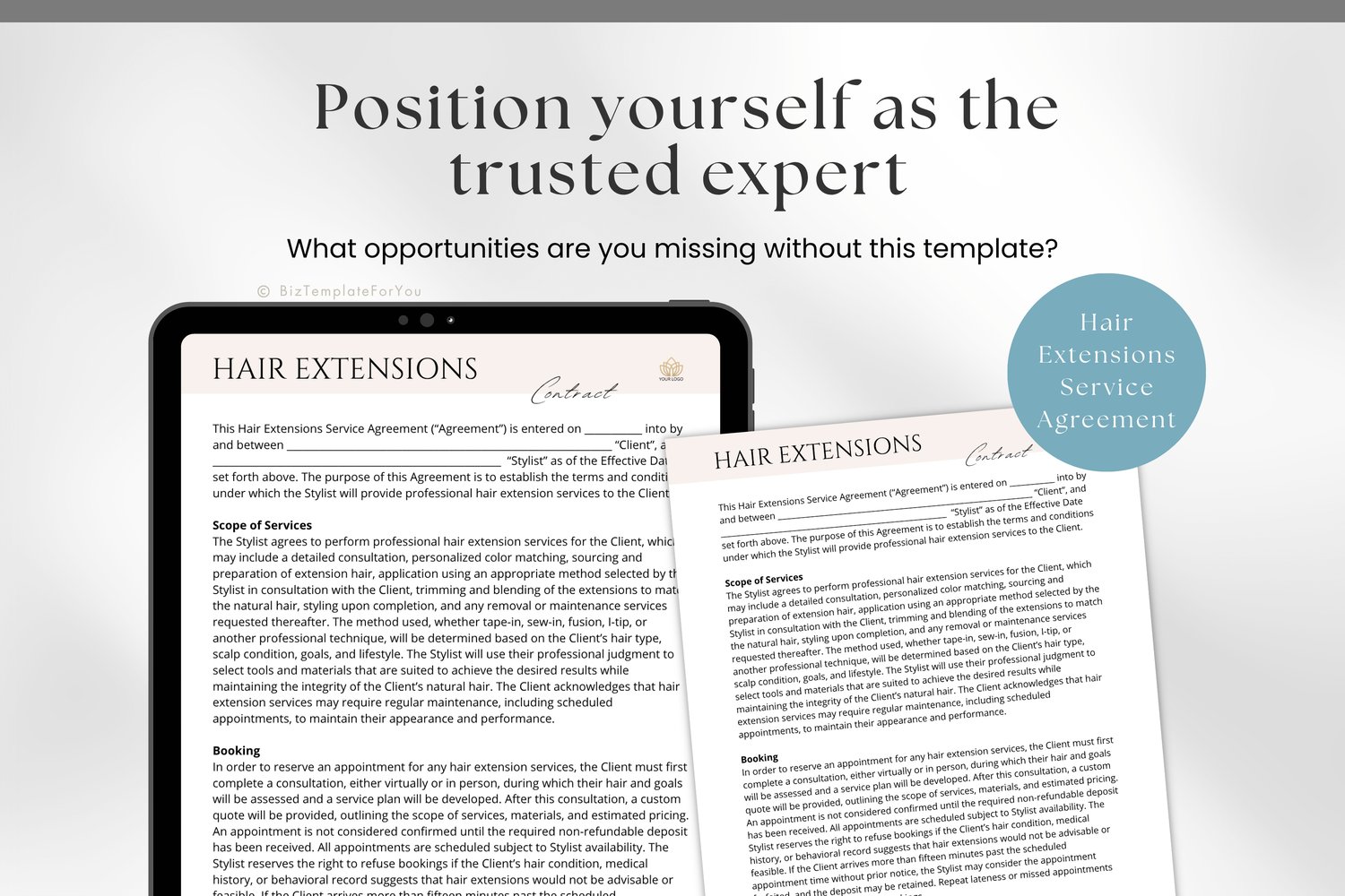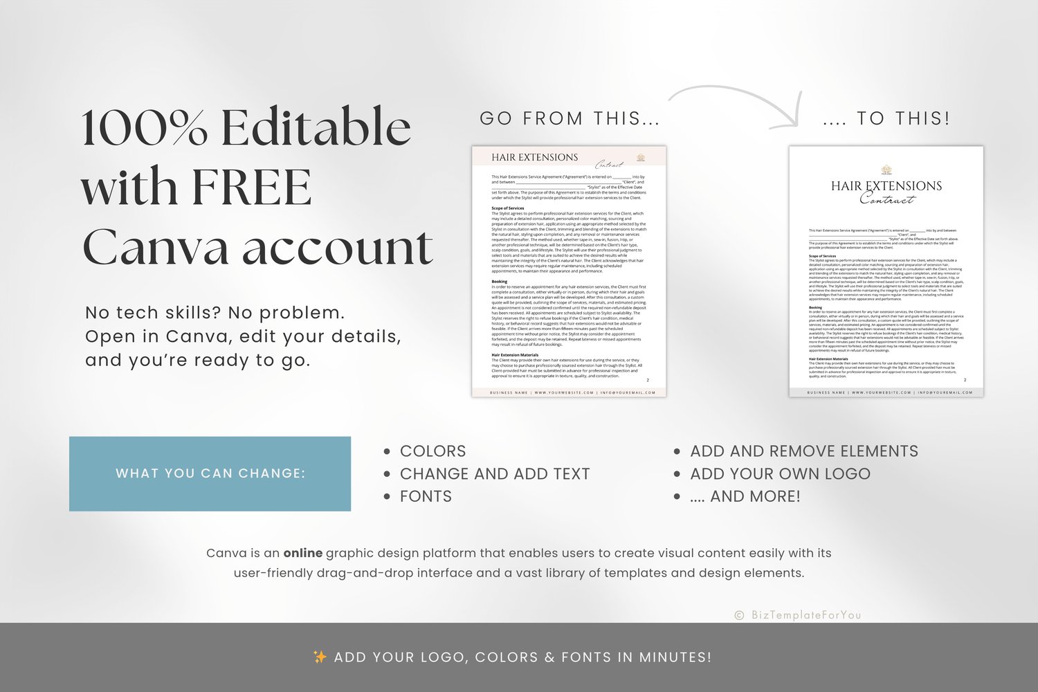 A fully editable Canva template (US Letter + A4) featuring a comprehensive Hair Extension Contract including the following clauses: