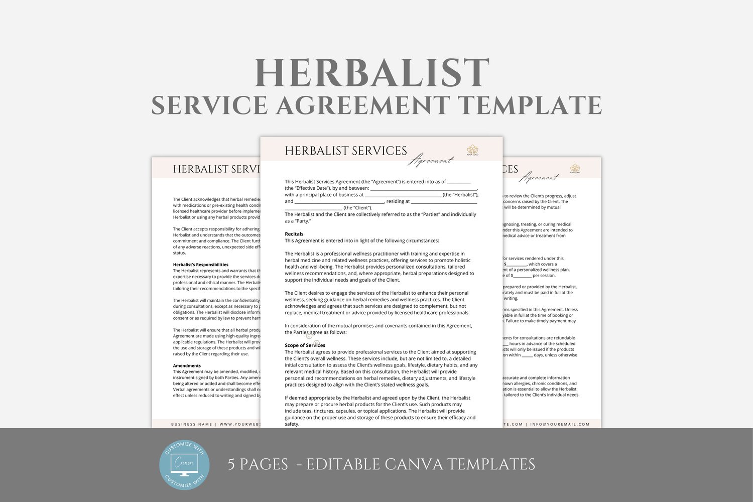 This is a 5-page Herbalist Service Agreement Template, editable in Canva (FREE Account)! The text is already written for you, but it is also easily edited in CANVA to add anything that is particular to your business or area. It is also completely customizable. Text, font, and colors are all fully editable to give you complete control of your branding and create a cohesive look for your business.