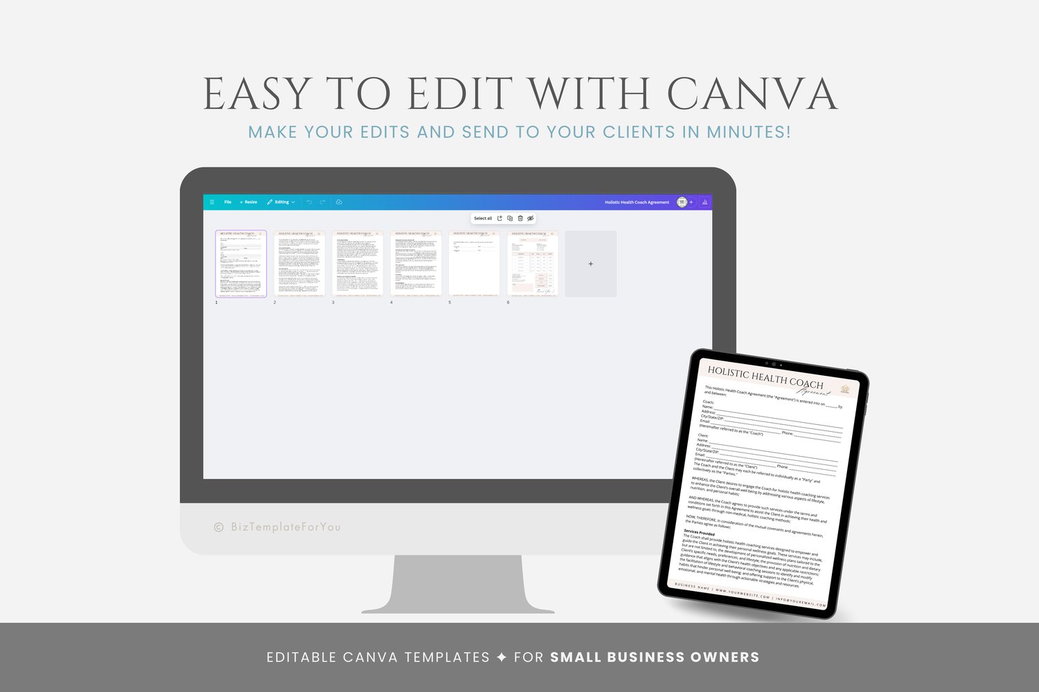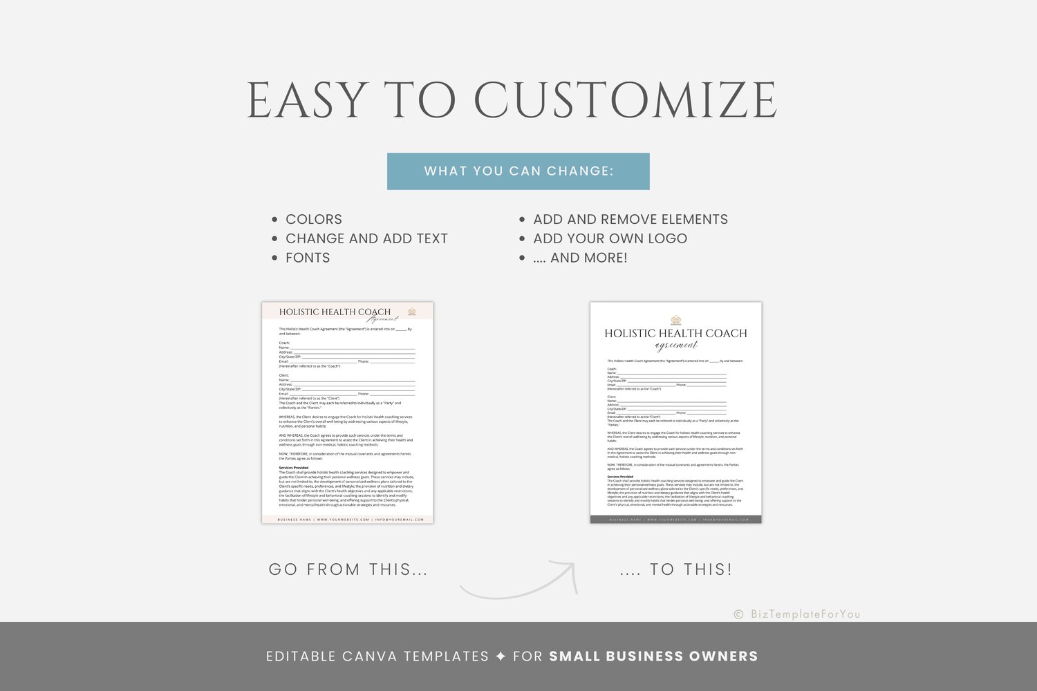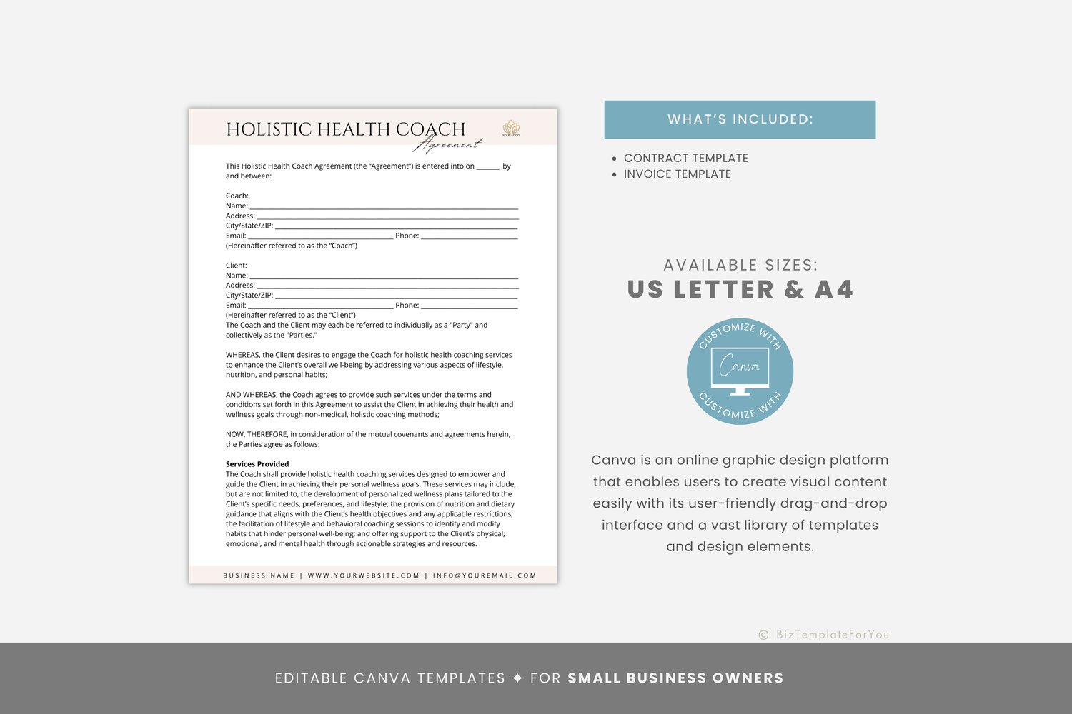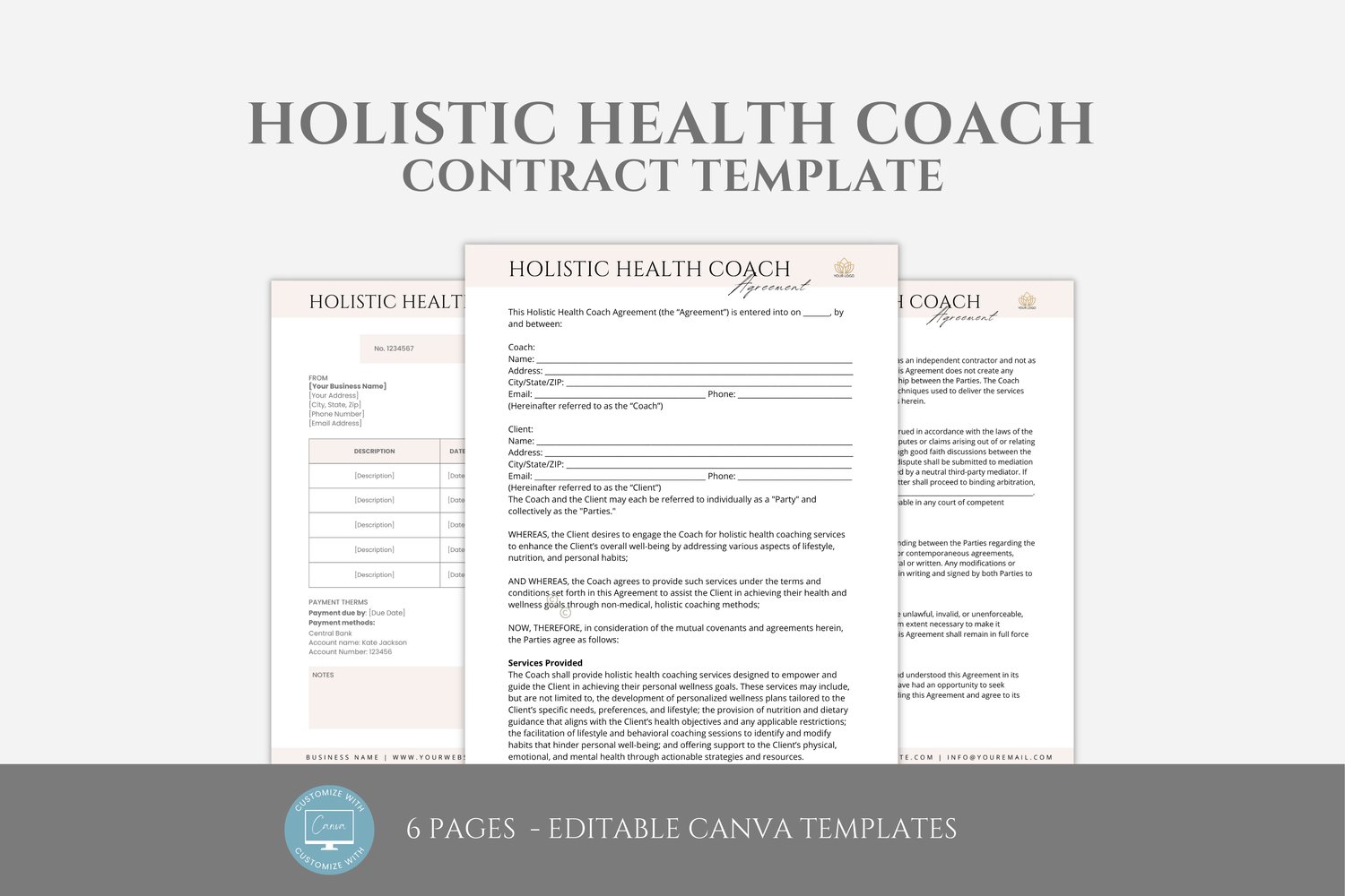 Editable Holistic Health Coach Contract Template, Wellness Coach Service Agreement, Coaching Business Contract Form, Canva editable #7041