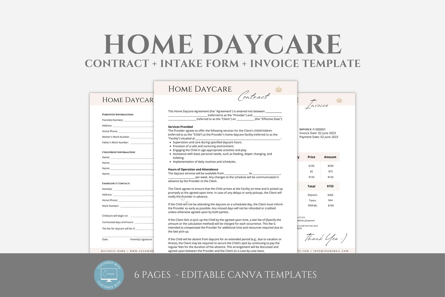 This is a 6-page Editable Home Daycare Contract Template editable in Canva (FREE Account)! The text is already written for you, but it is also easily edited in CANVA to add anything particular to your business or area. It is also completely customizable. Text, font, and colors are all fully editable to give you complete control of your branding and create a cohesive look for your business.