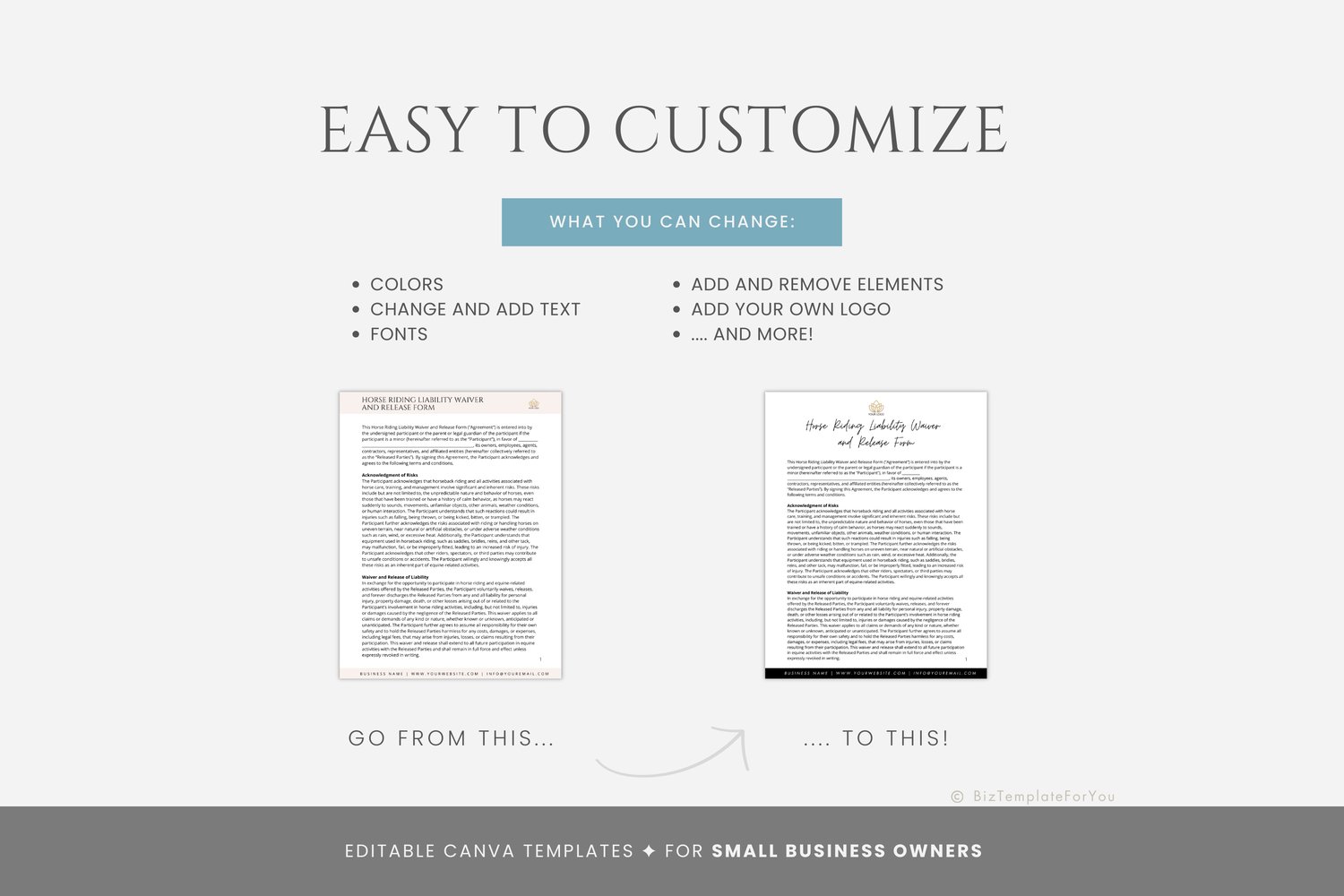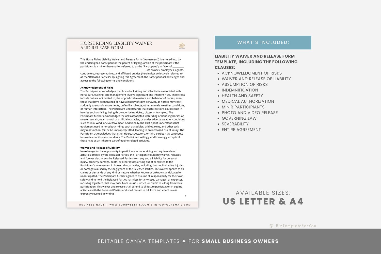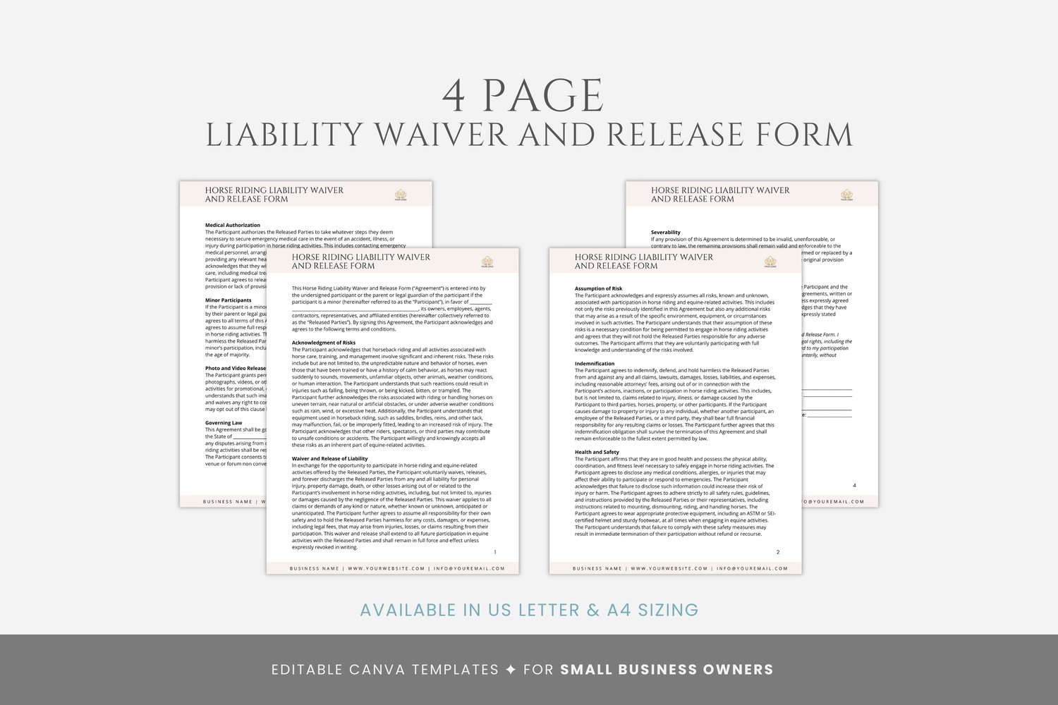 This is a 4-page Horse Riding Liability Waiver and Release Form Template editable in Canva (FREE Account)! The text is already written for you, but it is also easily edited in CANVA to add anything particular to your business or area. It is also completely customizable. Text, font, and colors are all fully editable to give you complete control of your branding and create a cohesive look for your business.