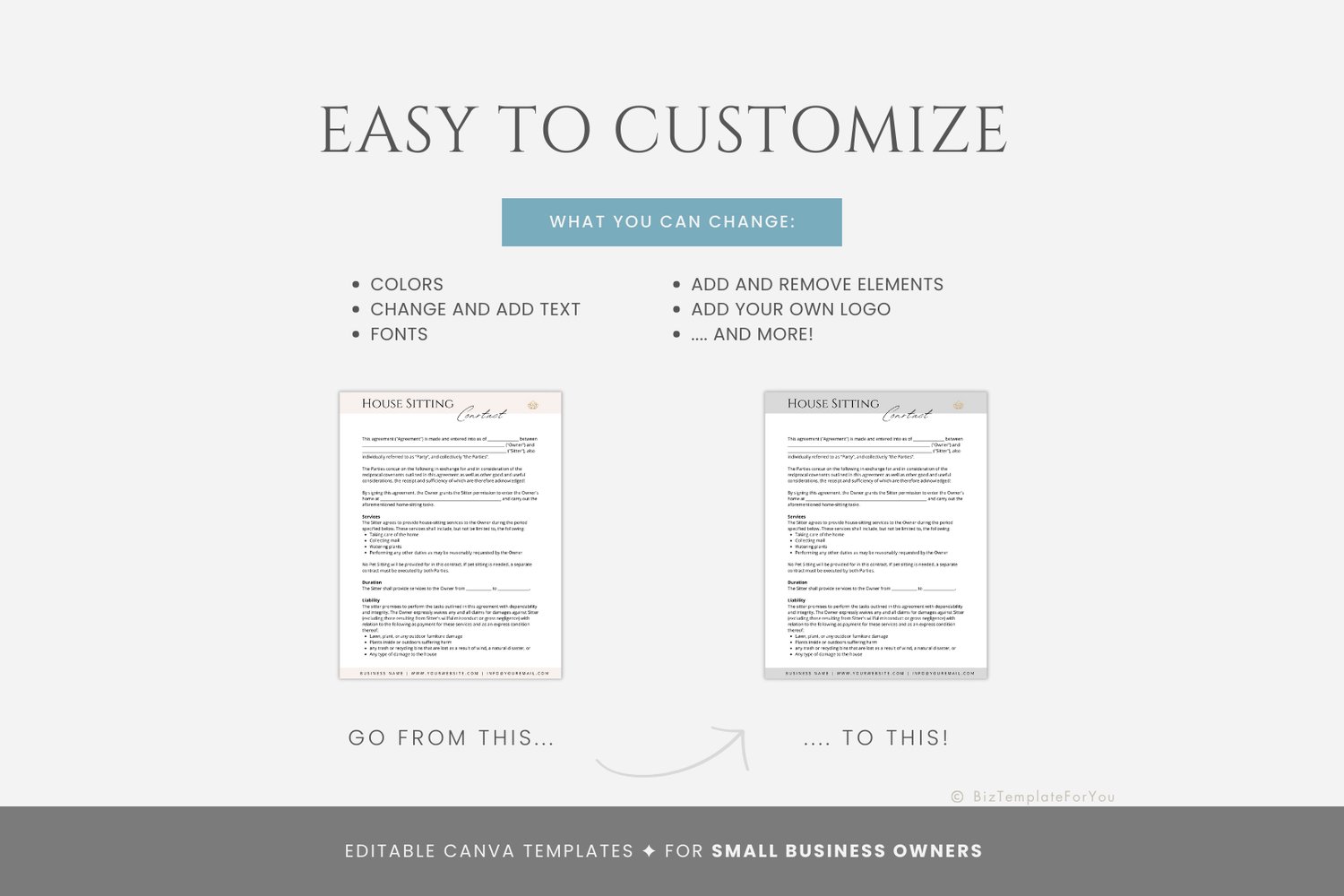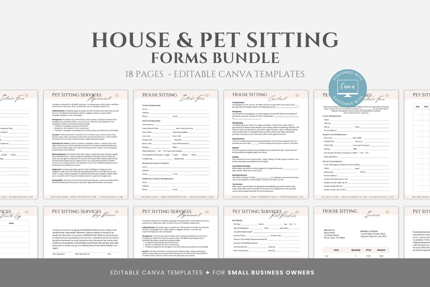 This is an 18-page Editable House Sitting Contract Template editable in Canva (FREE Account)! The text is already written for you but it is also easily edited in CANVA to add anything that is particular to your business or area it is also completely customizable. Text, font, and colors are all fully editable to give you complete control of your branding and create a cohesive look for your business.