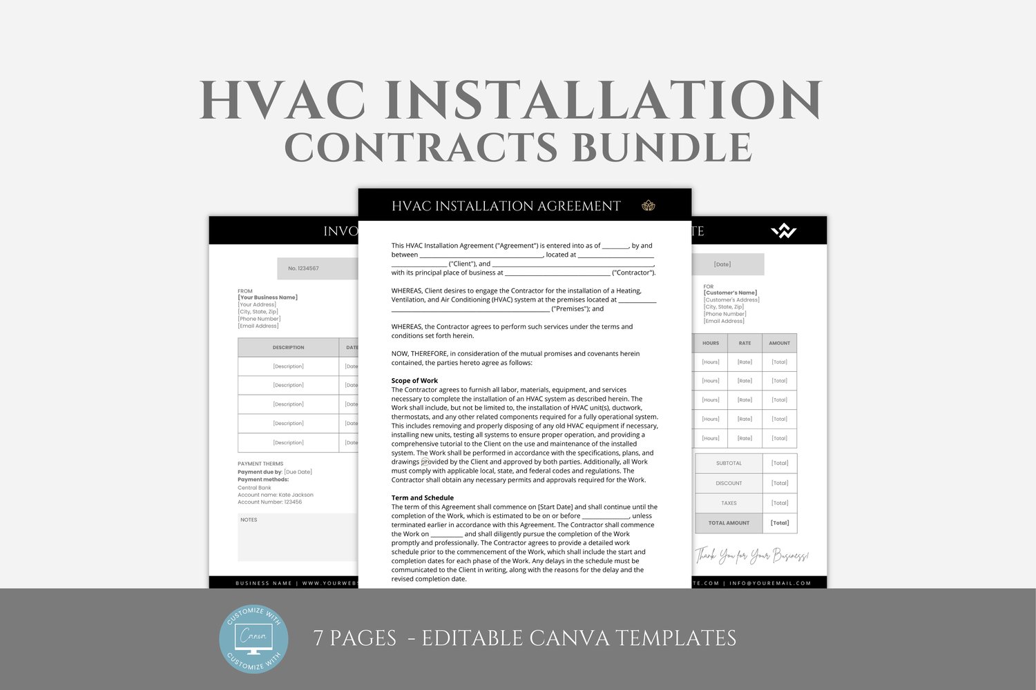 This is a 7-page HVAC Installation Contract Template editable in Canva (FREE Account)! The text is already written for you, but it can also be easily edited in CANVA to add anything particular to your business or area. It is also completely customizable. Text, font, and colors are all fully editable to give you complete control of your branding and create a cohesive look for your business.