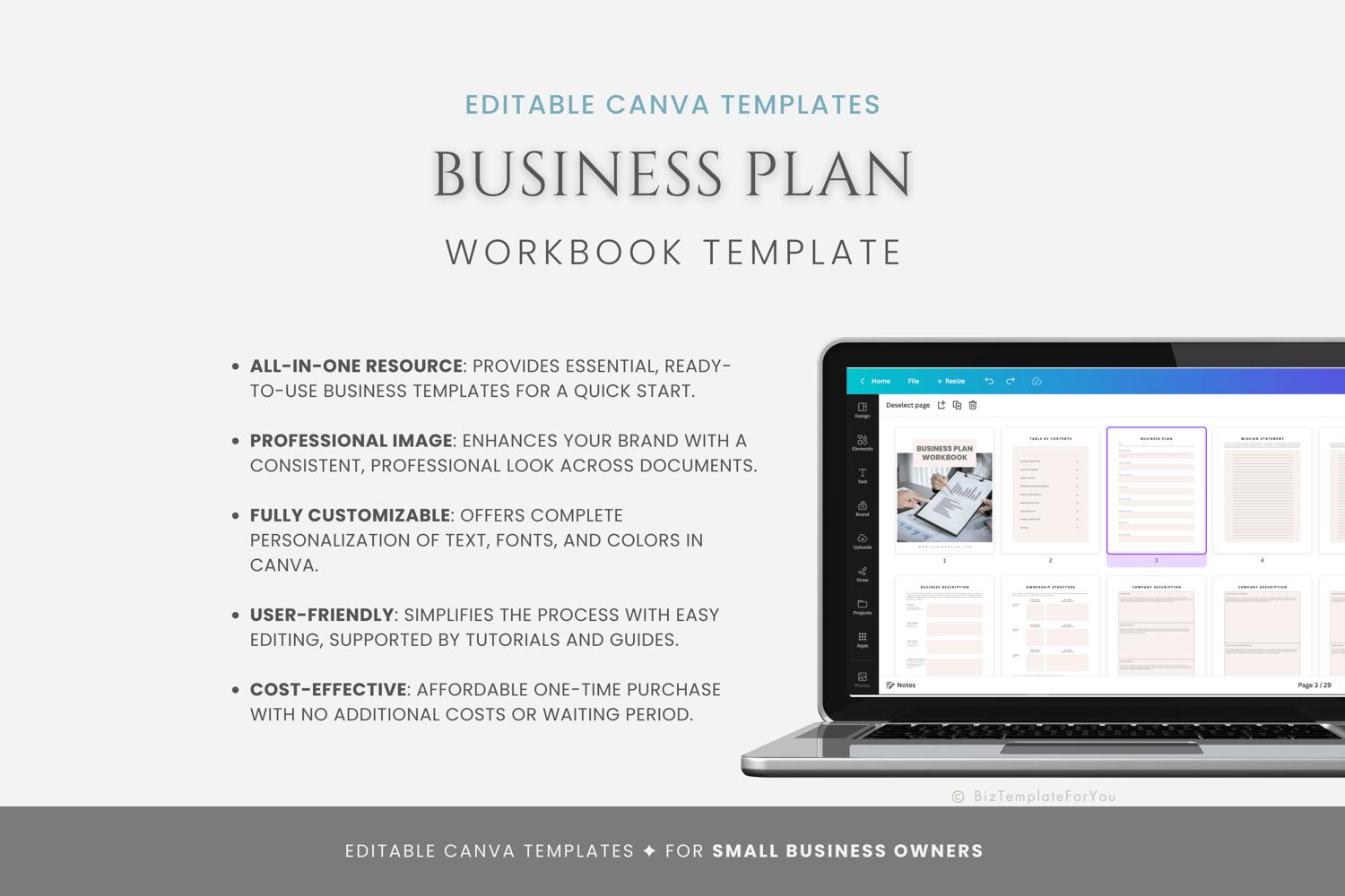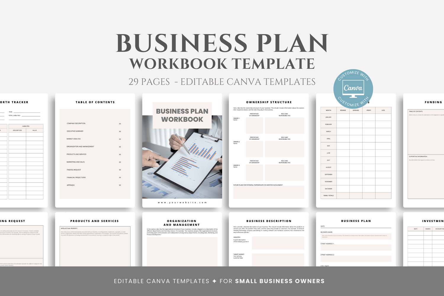This is a 29-page Business Plan Workbook Template editable in Canva (FREE Account)! The text is already written for you, but it is also easily edited in CANVA to add anything that is particular to your business or area. It is also completely customizable. Text, font, and colors are all fully editable to give you complete control of your branding and create a cohesive look for your business.
