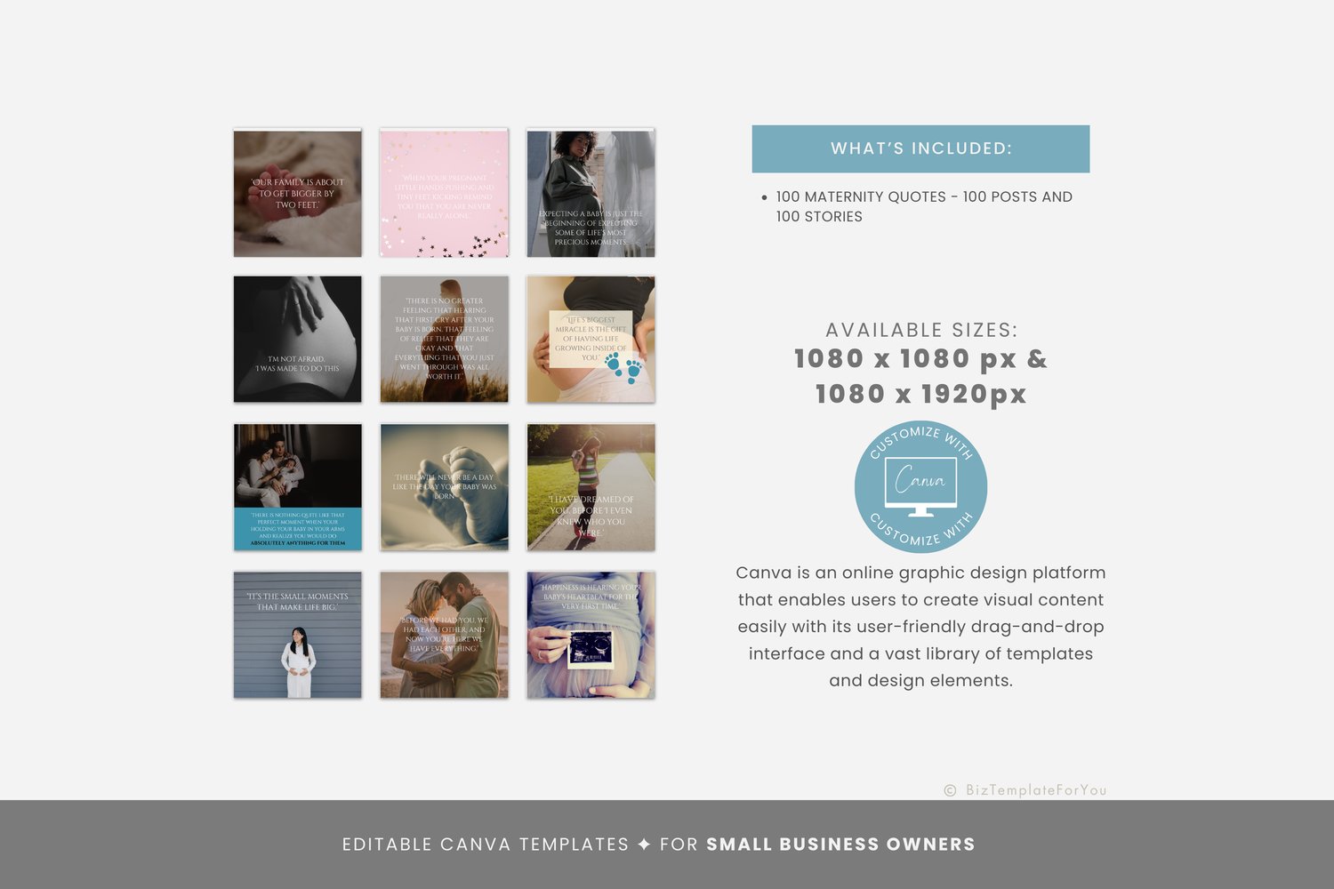 This 200 Instagram Post Template Set is a premium social media templates bundle. It is ideal for pregnant women and moms, but also for birth doulas, postpartum doulas, Sleep coaches, sleep consultants, lactation consultants, and other baby-related service providers. The set is ready to customize in Canva. Each design can be edited with your photography and text to align with your brand and style.