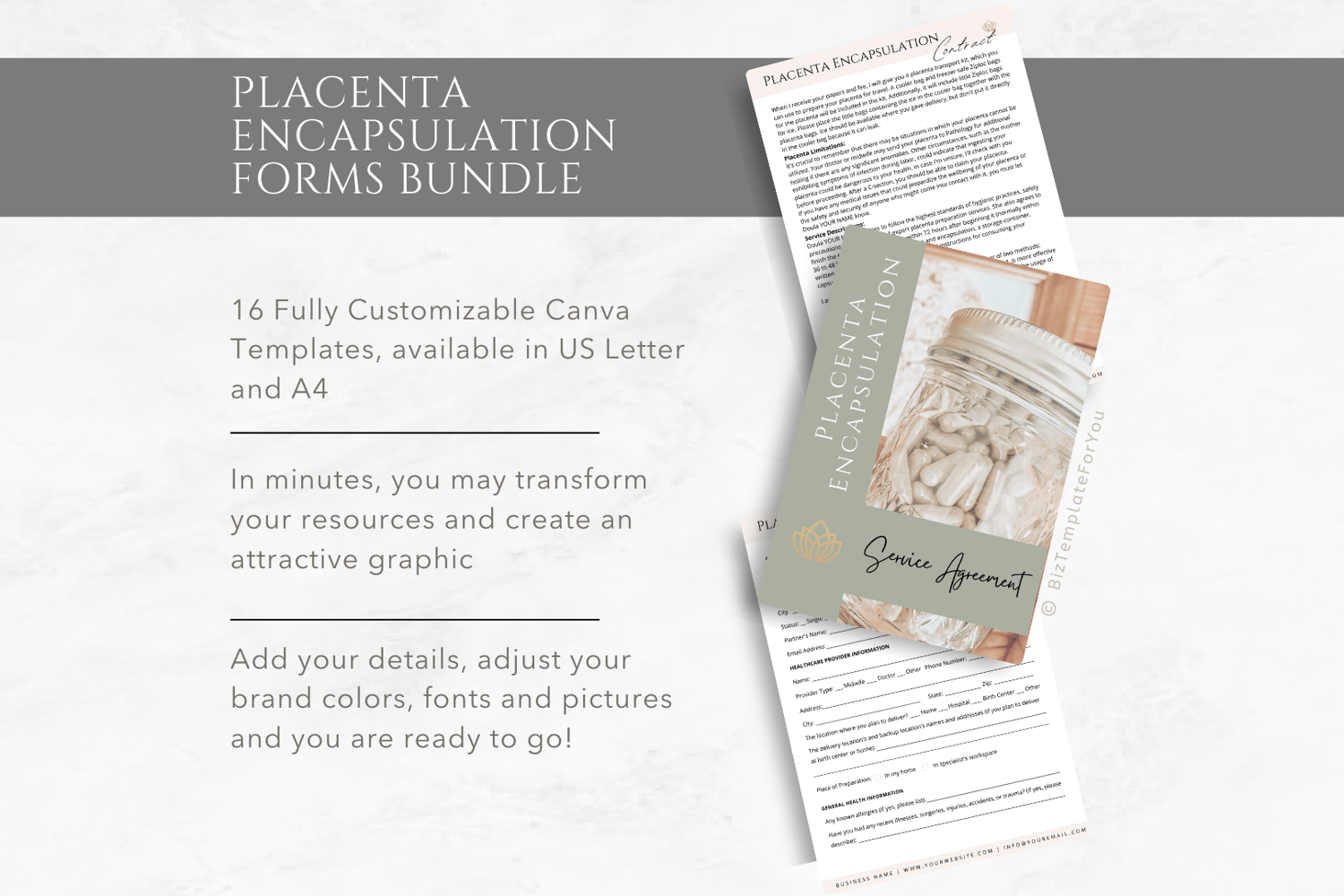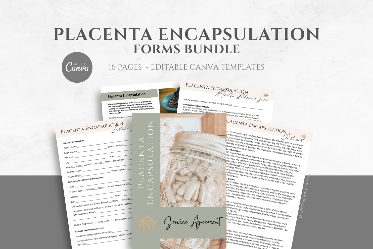 This is a 16-page Placenta Encapsulation Forms Bundle Template editable in Canva (FREE Account)! The text is already written for you, but it is also easily edited in CANVA to add anything that is particular to your business or area. It is also completely customizable. Text, font, and colors are all fully editable to give you complete control of your branding and create a cohesive look for your business.