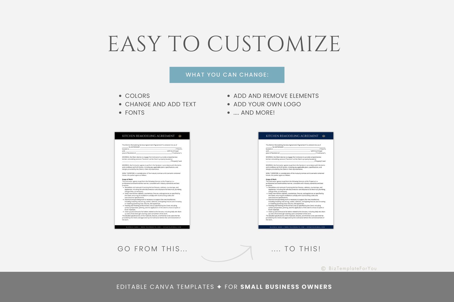 This is a 6-page Kitchen Remodeling Service Agreement editable in Canva (FREE Account)! The text has already been written for you, but it can also be easily edited in CANVA to add anything particular to your business or area. It is also completely customizable. Text, font, and colors are all fully editable to give you complete control of your branding and create a cohesive look for your business.