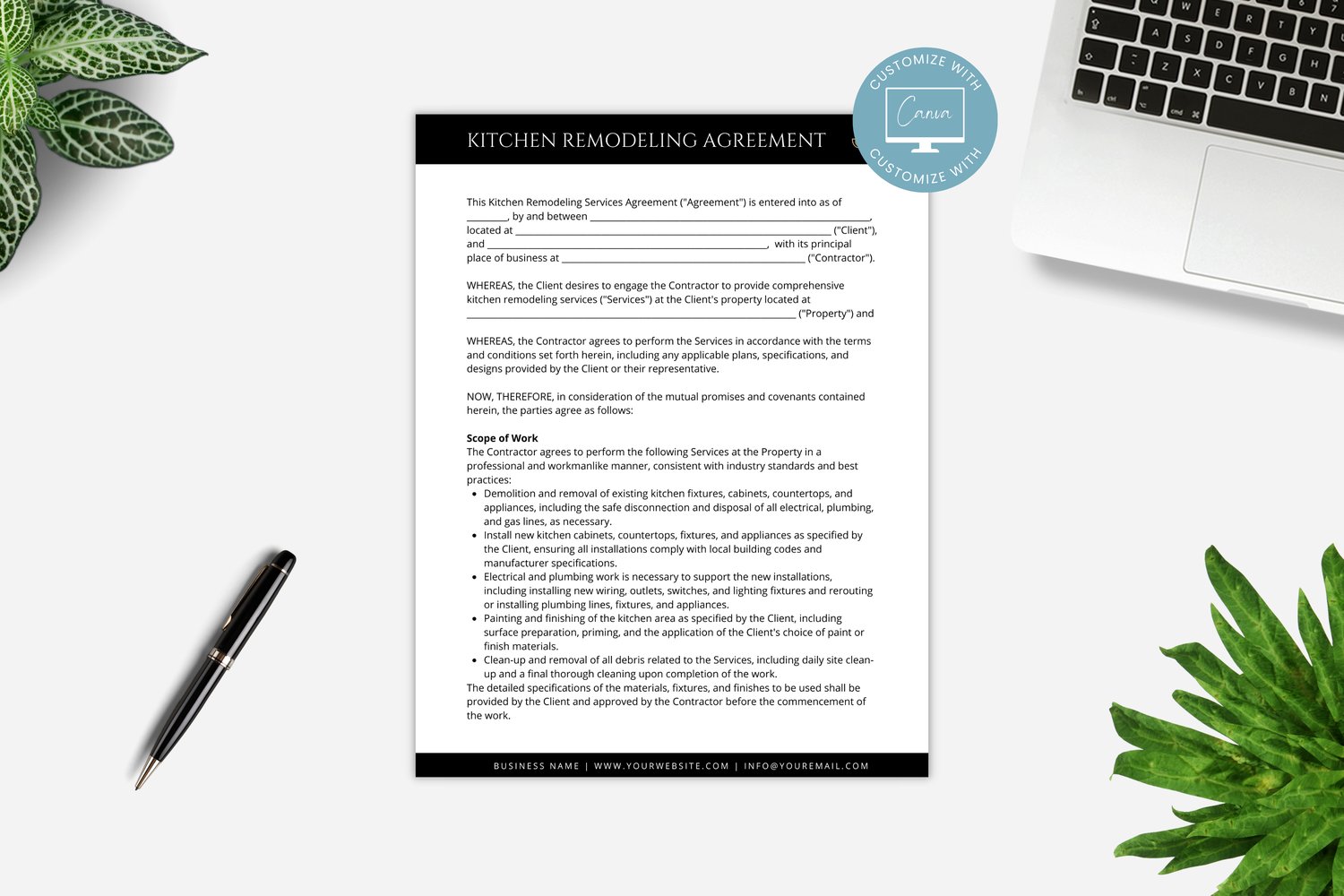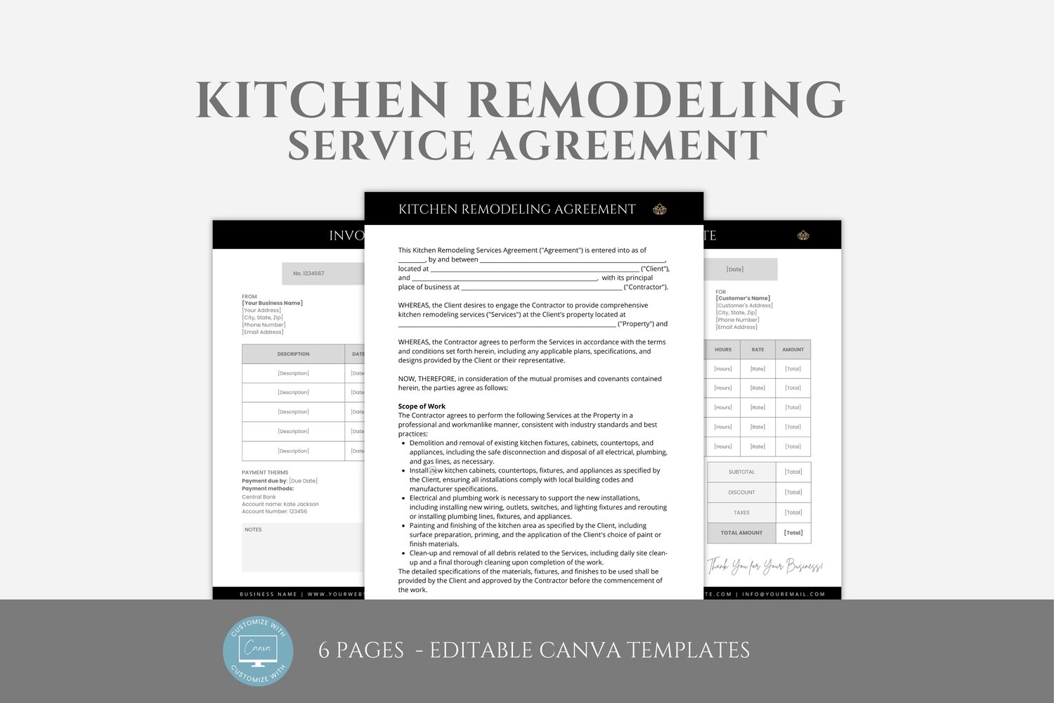 Editable Kitchen Remodeling Service Agreement, Custom Kitchen Contract Template, Remodeling Business Forms, incl. Invoice Template, Canva editable #6083