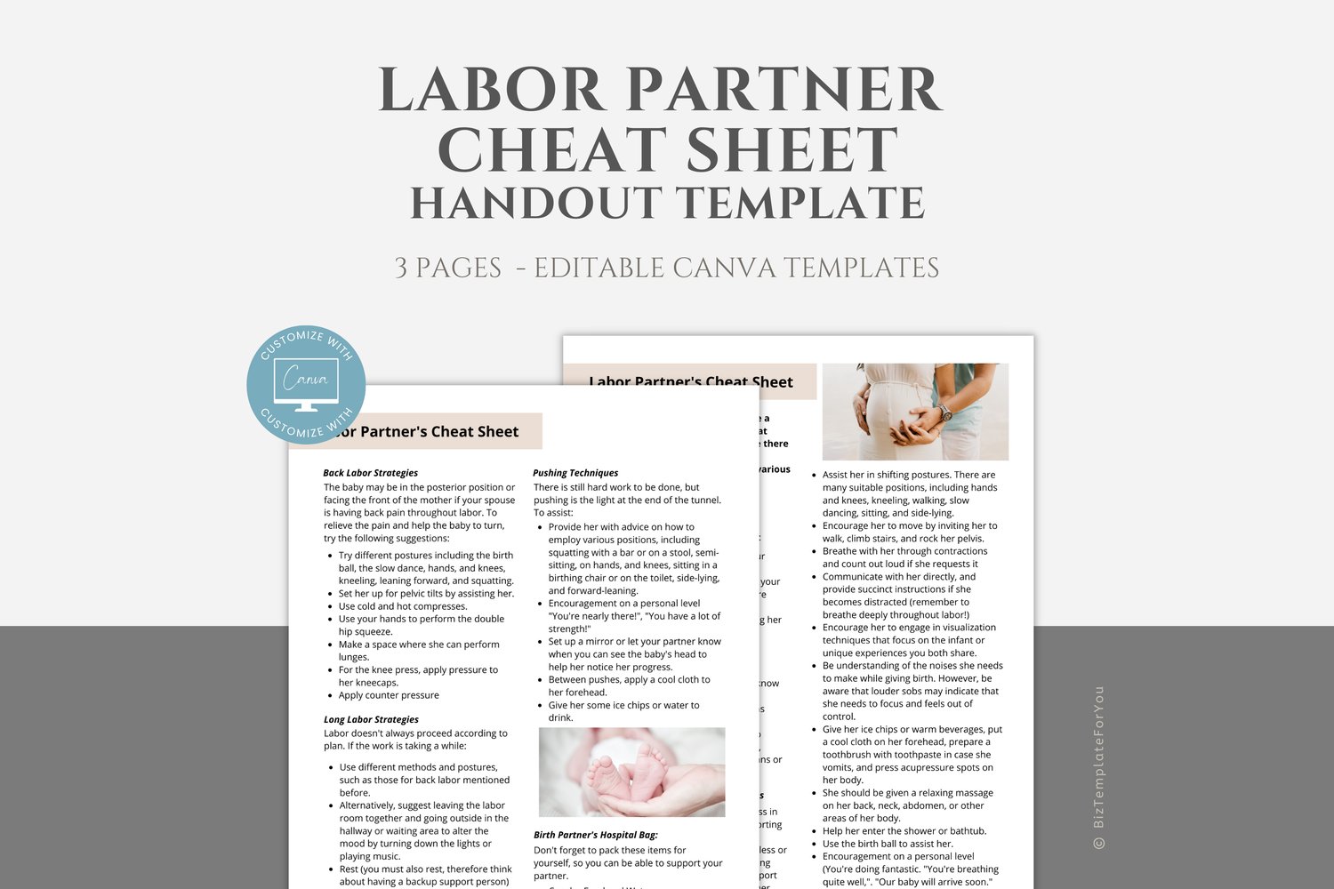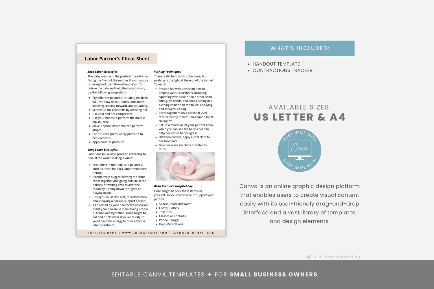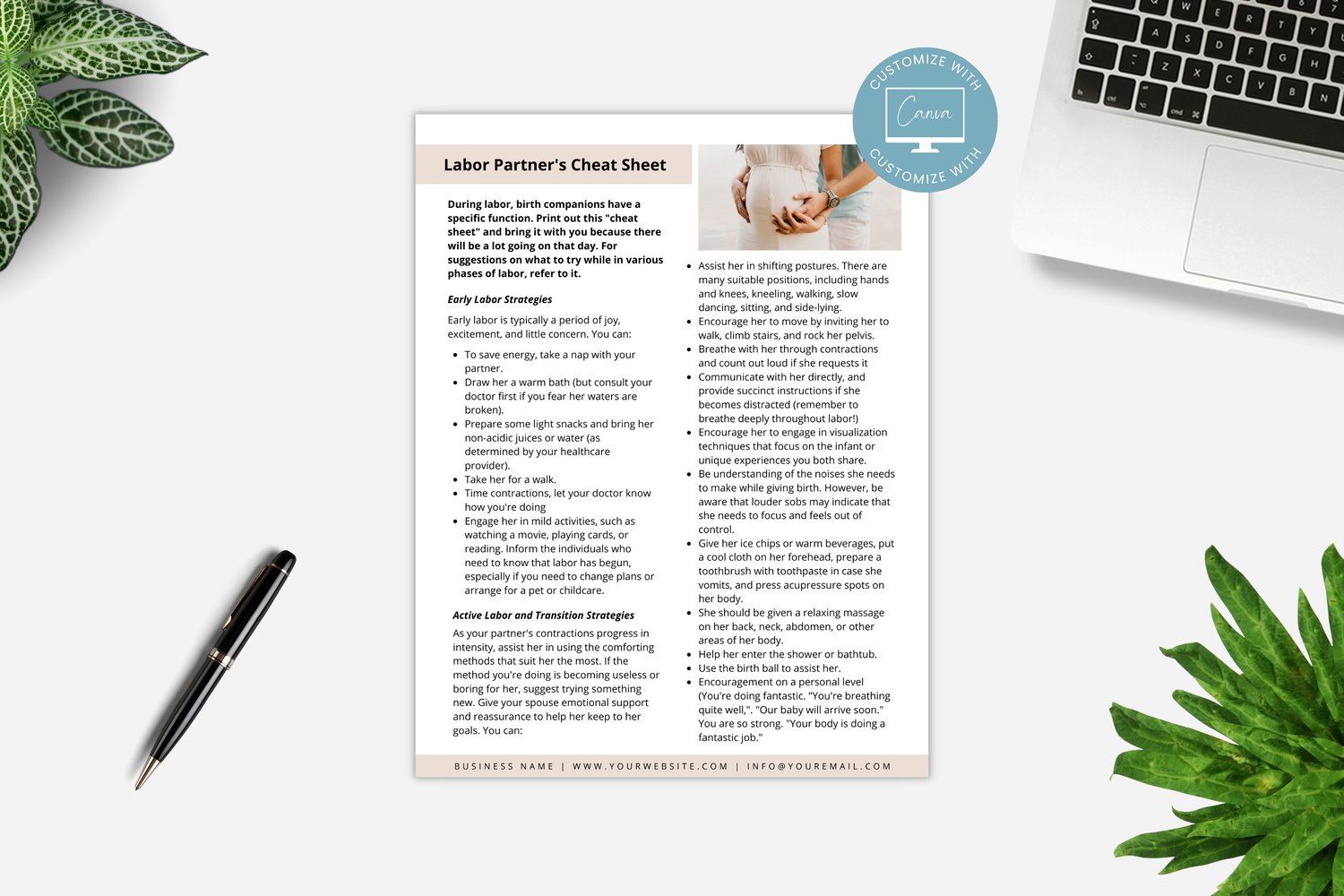 Editable Labor Partner Cheat Sheet Template, Birth Partner Info Sheet, Handout Template for Birth Doulas, Midwives, Canva editable #1041