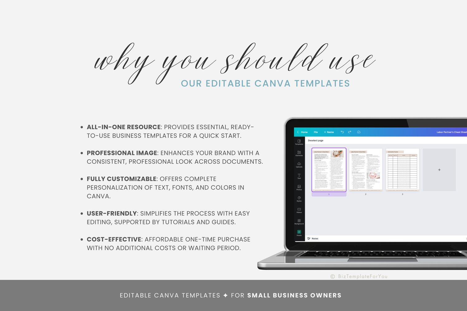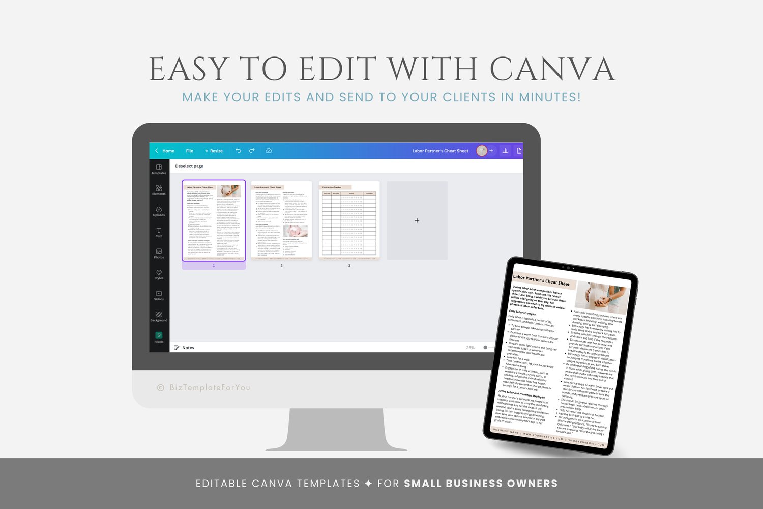 This is a 3-page Labor Partner Cheat Sheet Template editable in Canva (FREE Account)! The text is already written for you, but it is also easily edited in CANVA to add anything that is particular to your business or area. It is also completely customizable. Text, font, and colors are all fully editable to give you complete control of your branding and create a cohesive look for your business.