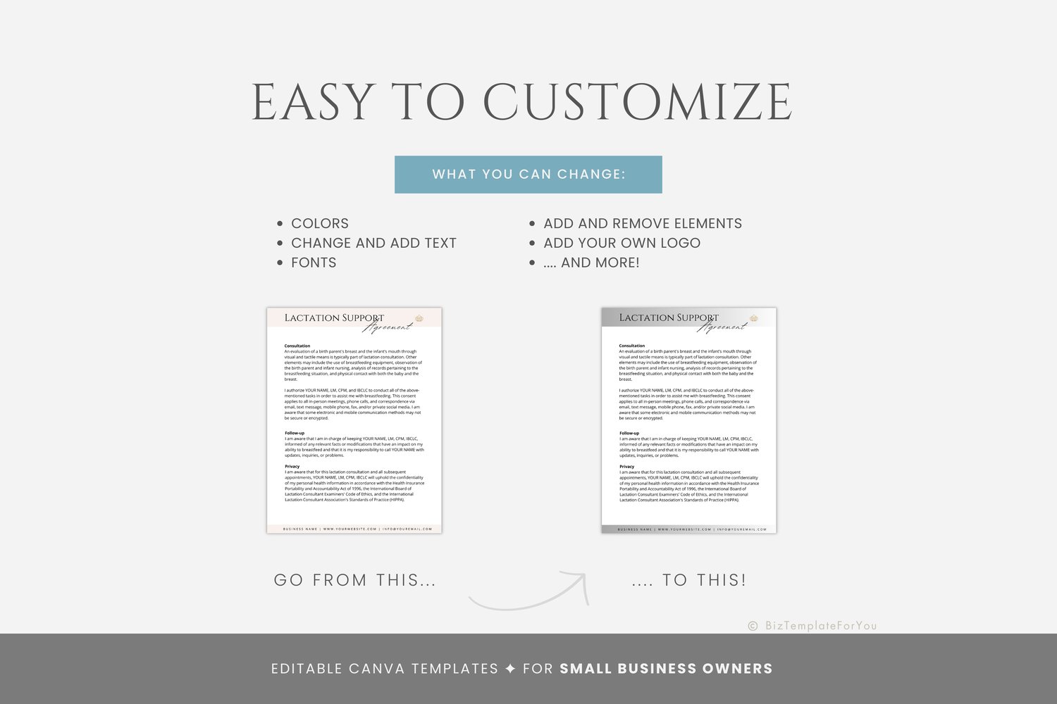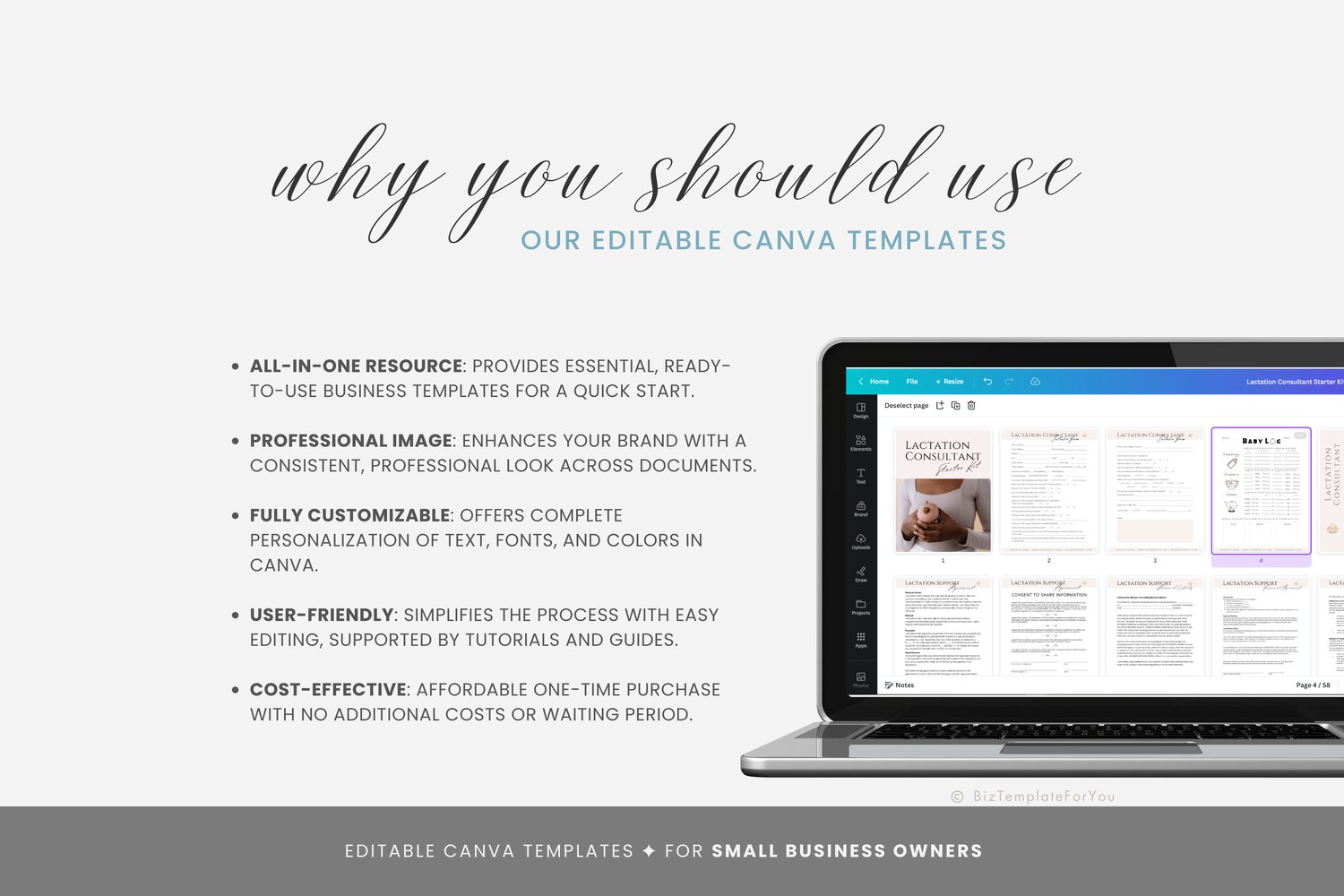 This is a 262-page Lactation Consultant Business Starter Kit Bundle, Templates editable in Canva (FREE Account)! The text is already written for you, but it is also easily edited in CANVA to add anything that is particular to your business or area. It is also completely customizable. Text, font, and colors are all fully editable to give you complete control of your branding and create a cohesive look for your business.