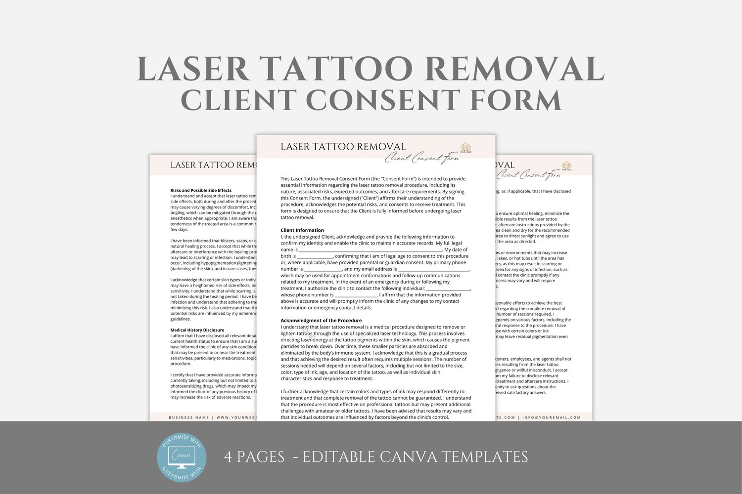 This is a 4-page Laser Tattoo Removal Client Consent Form Template editable in Canva (FREE Account)! The text has already been written for you, but it can also be easily edited in CANVA to add anything particular to your business or area. It is also completely customizable. Text, font, and colors are all fully editable to give you complete control of your branding and create a cohesive look for your business.