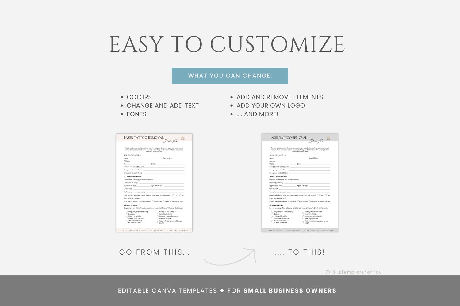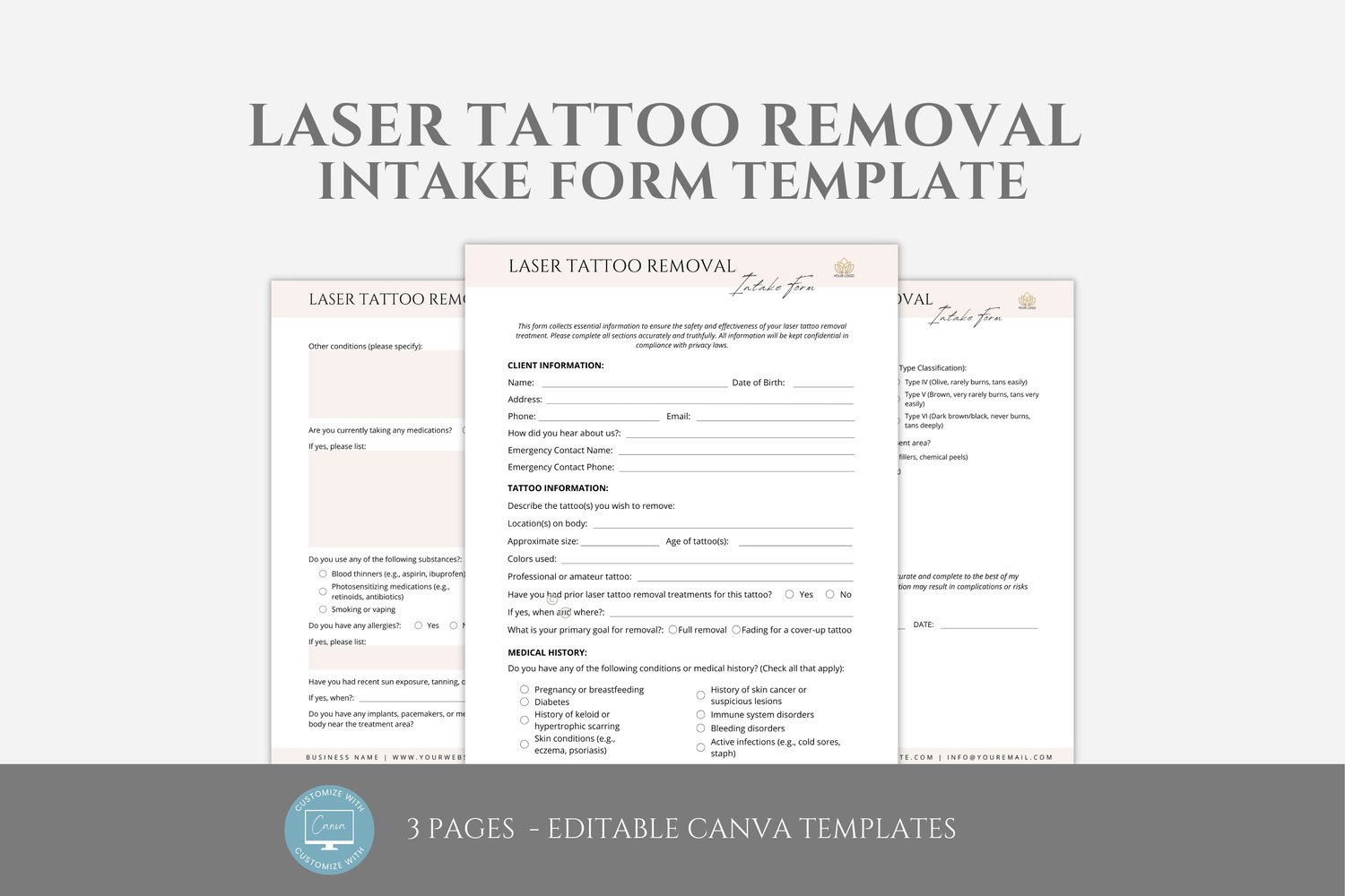 This is a 3-page Laser Tattoo Removal Client Intake Form Template editable in Canva (FREE Account)! The text has already been written for you, but it can also be easily edited in CANVA to add anything particular to your business or area. It is also completely customizable. Text, font, and colors are all fully editable to give you complete control of your branding and create a cohesive look for your business.