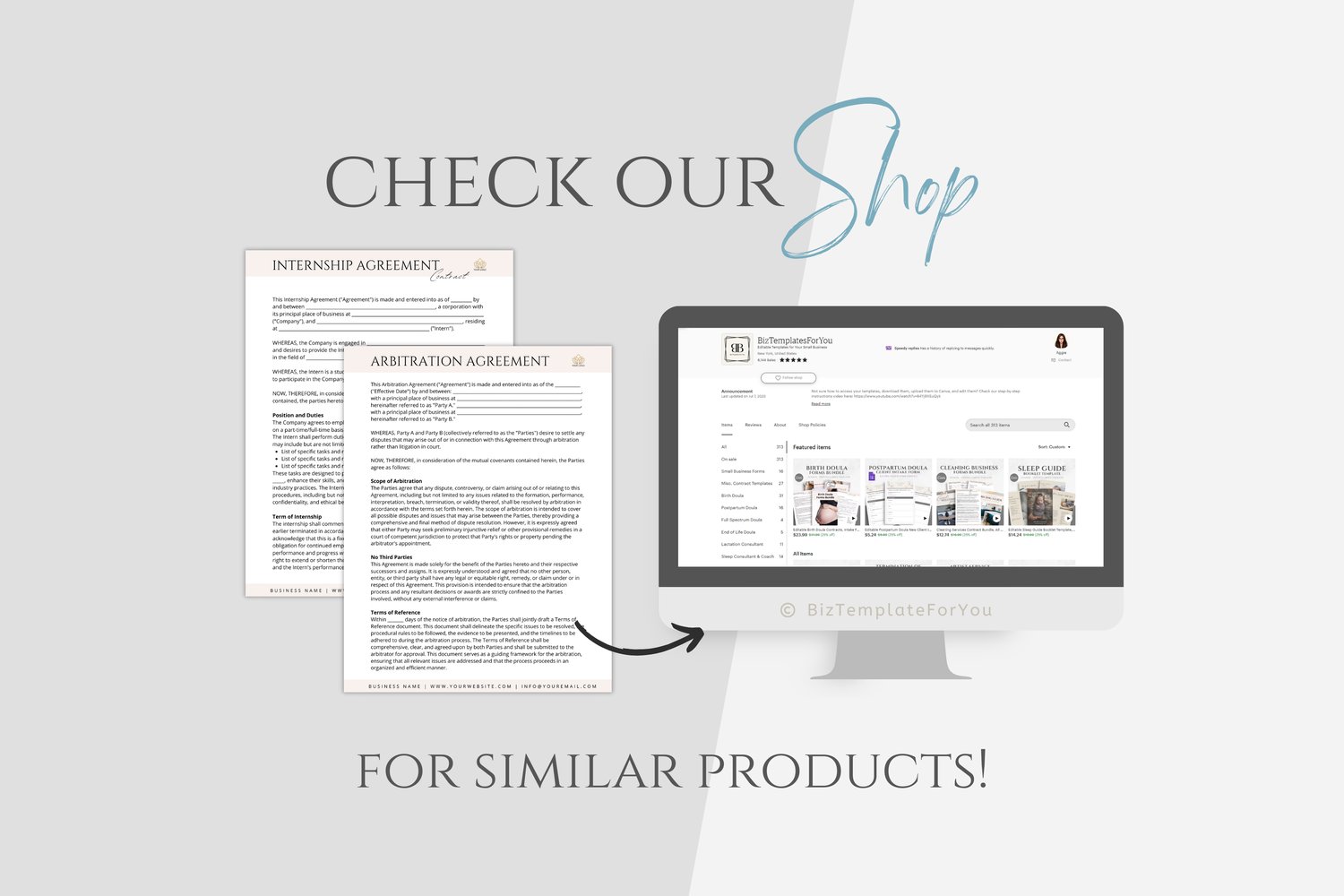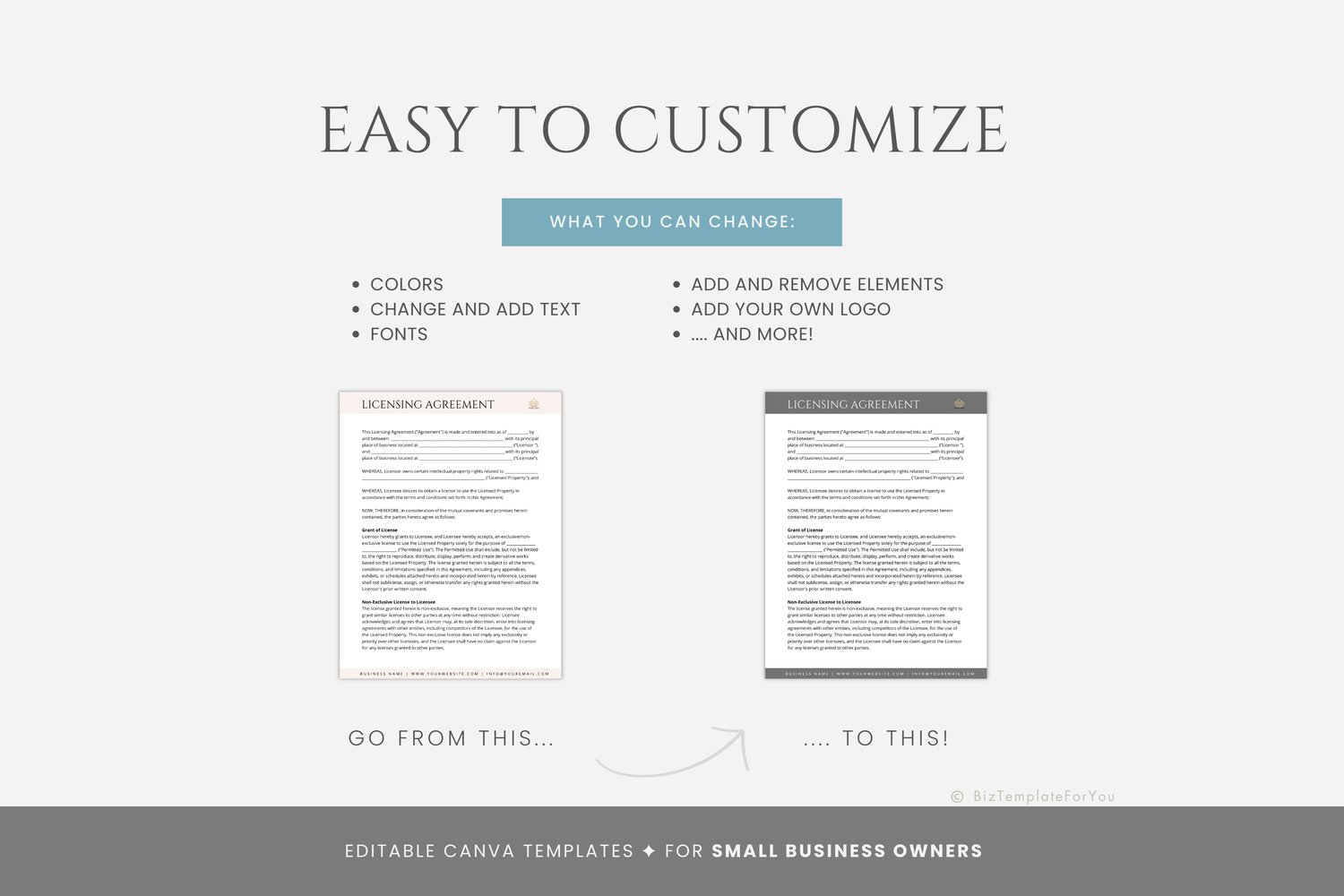 This is an 8-page Licensing Agreement Template editable in Canva (FREE Account)! The text is already written for you, but it can also be easily edited in CANVA to add anything particular to your business or area. It is also completely customizable. Text, font, and colors are all fully editable to give you complete control of your branding and create a cohesive look for your business.