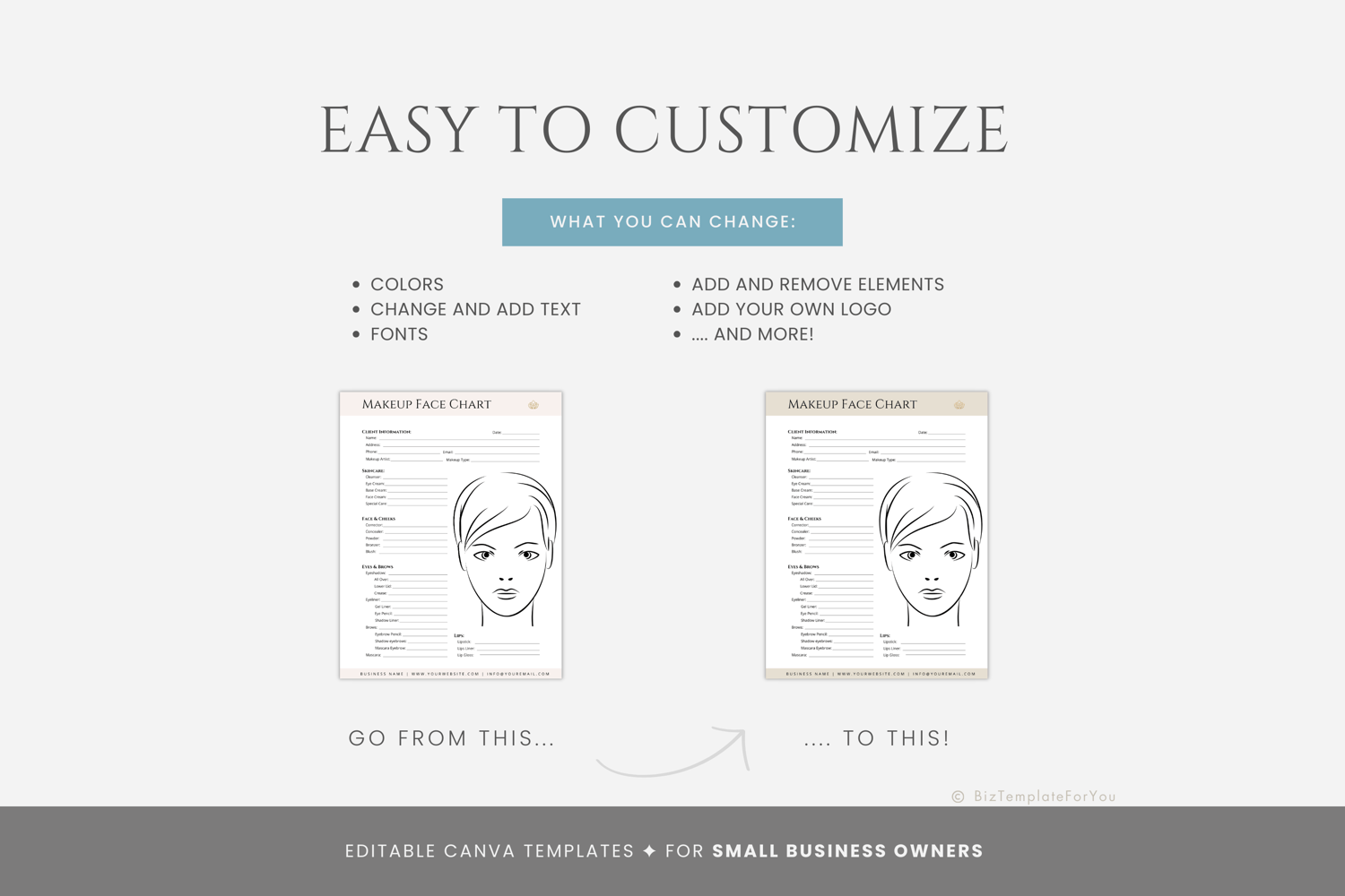 This is a one-page Makeup Face Chart Template editable in Canva (FREE Account)! The text is already written for you, but it can also be easily edited in CANVA to add anything particular to your business or area. It is also completely customizable. Text, font, and colors are all fully editable to give you complete control of your branding and create a cohesive look for your business.