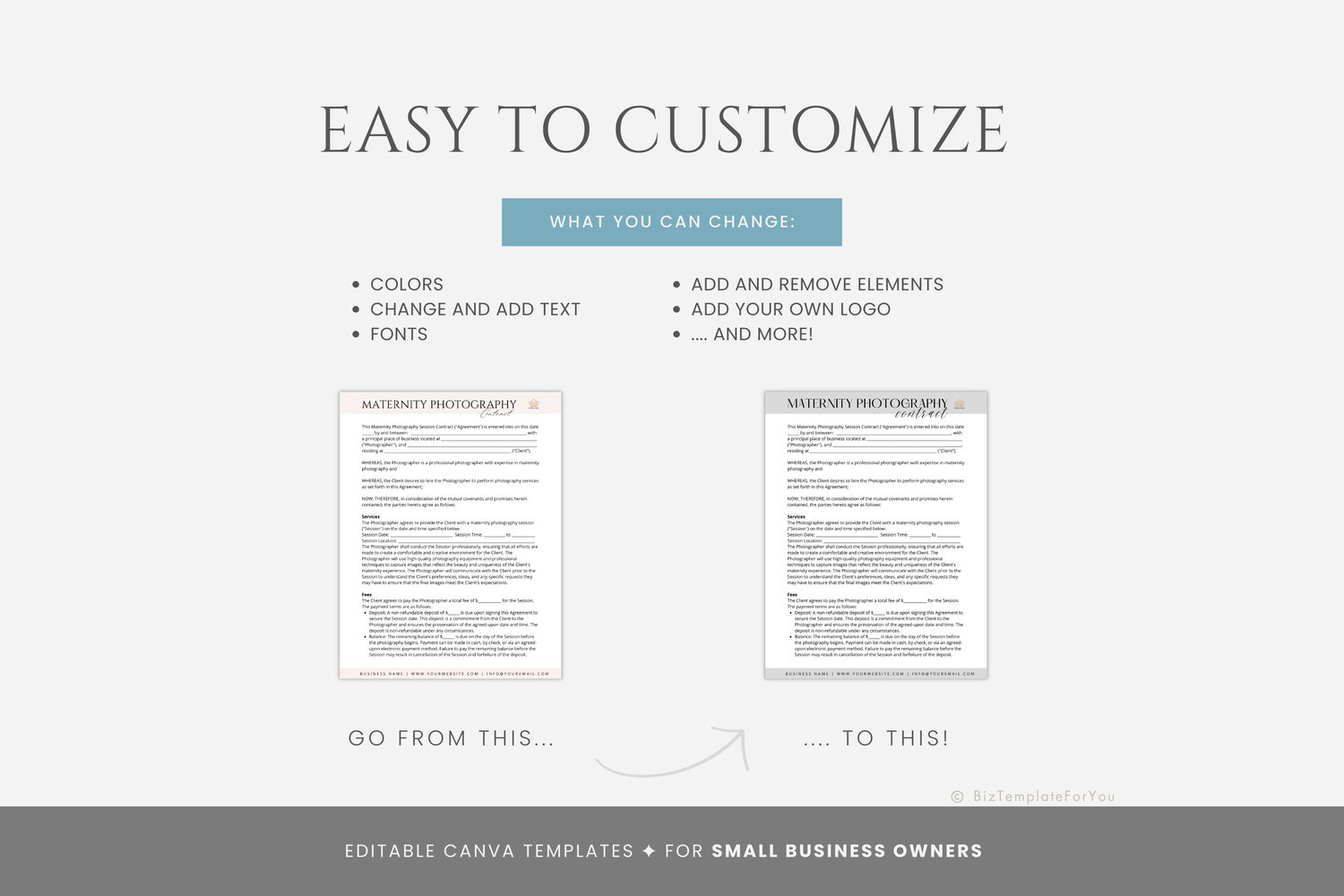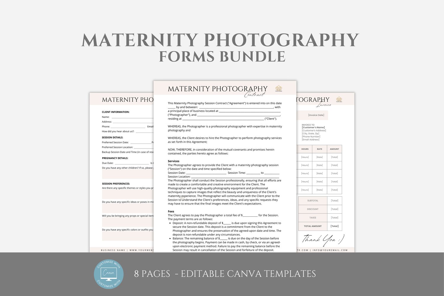 This is an 8-page Maternity Photography Contract Template bundle editable in Canva (FREE Account)! The text is already written for you, but it is also easily edited in CANVA to add anything particular to your business or area. It is also completely customizable. Text, font, and colors are all fully editable to give you complete control of your branding and create a cohesive look for your business.
