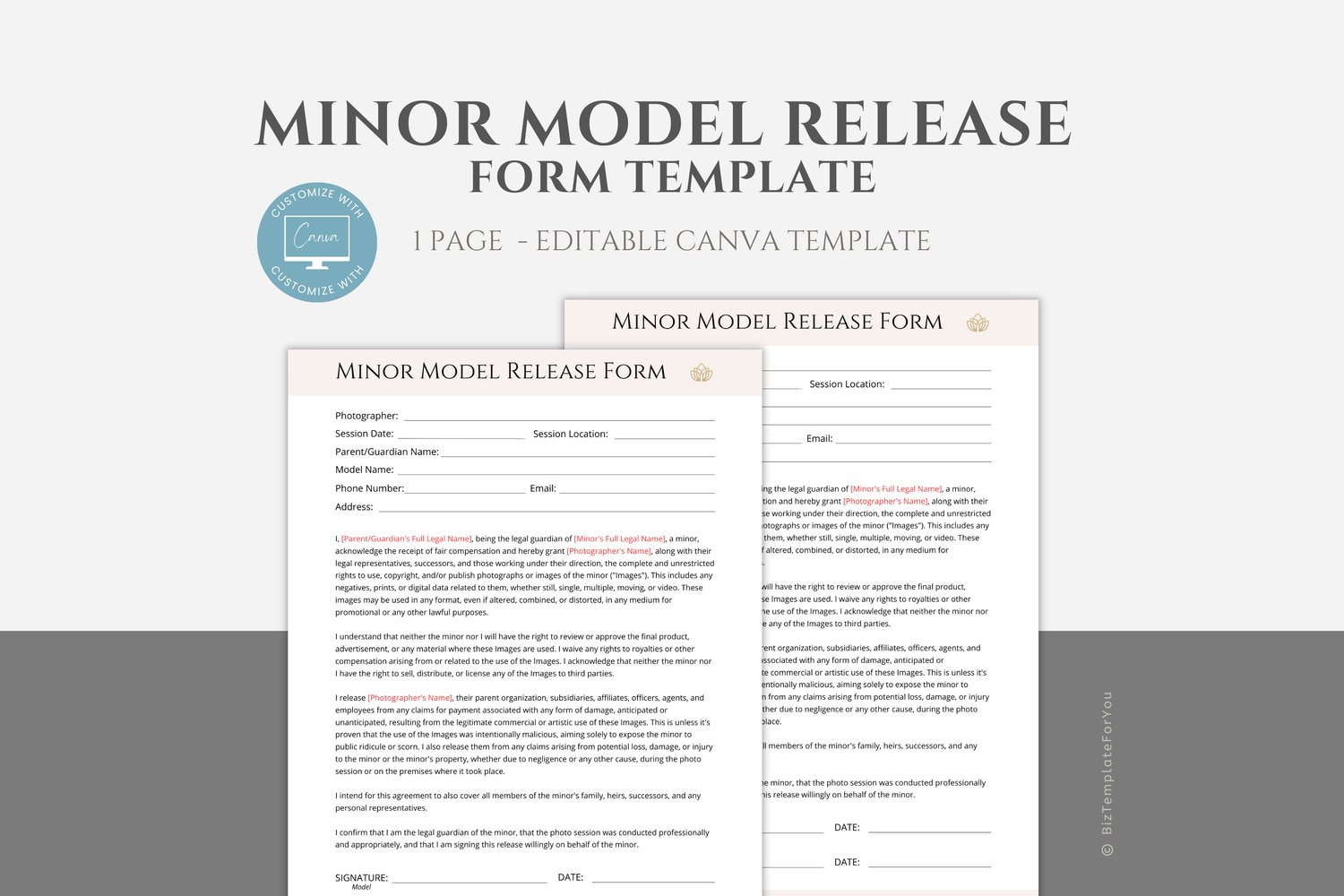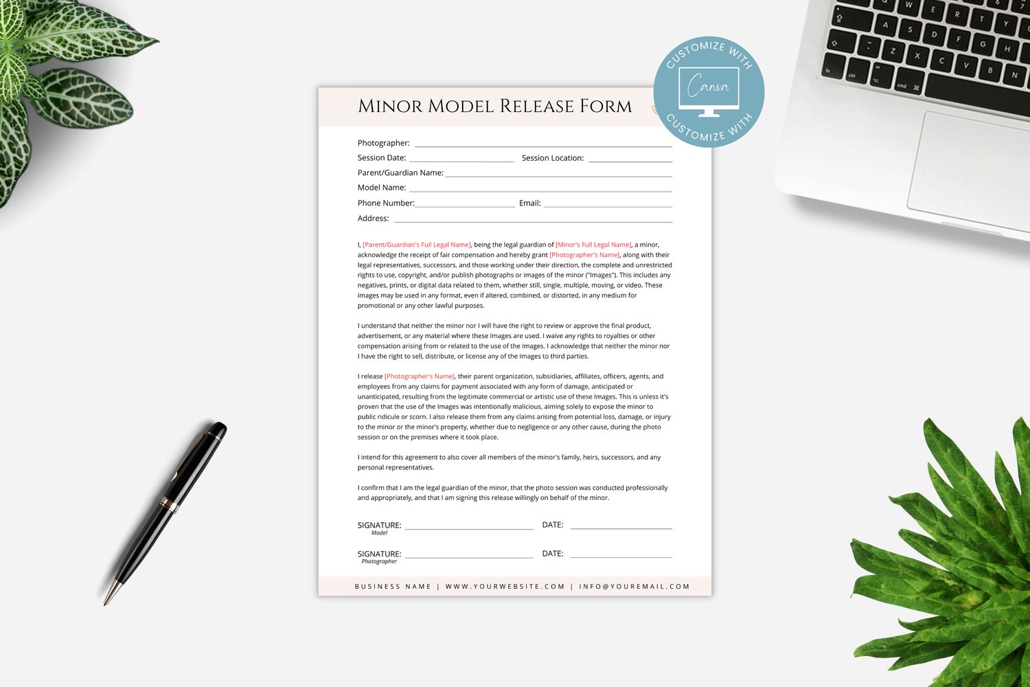 Editable Minor Model Release Form Template for Photographers, Minor Model Release Document, Photography Business Form Canva Template, Canva editable #4017