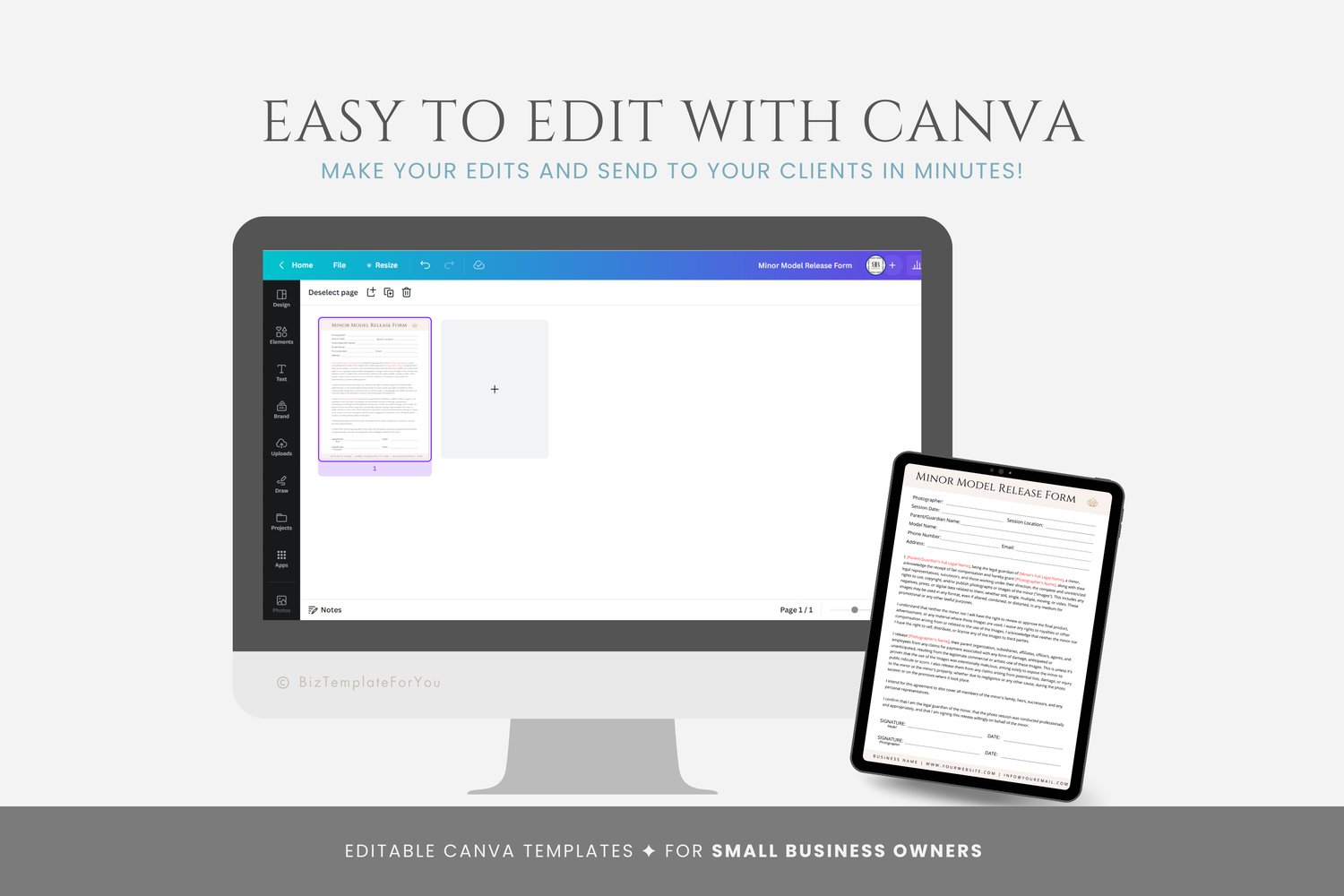 This is a 1-page Editable Minor Model Release Form Template for Photographers, editable in Canva (FREE Account)! The text is already written for you, but it is also easily edited in CANVA to add anything particular to your business or area. It is also completely customizable. Text, font, and colors are all fully editable to give you complete control of your branding and create a cohesive look for your business.