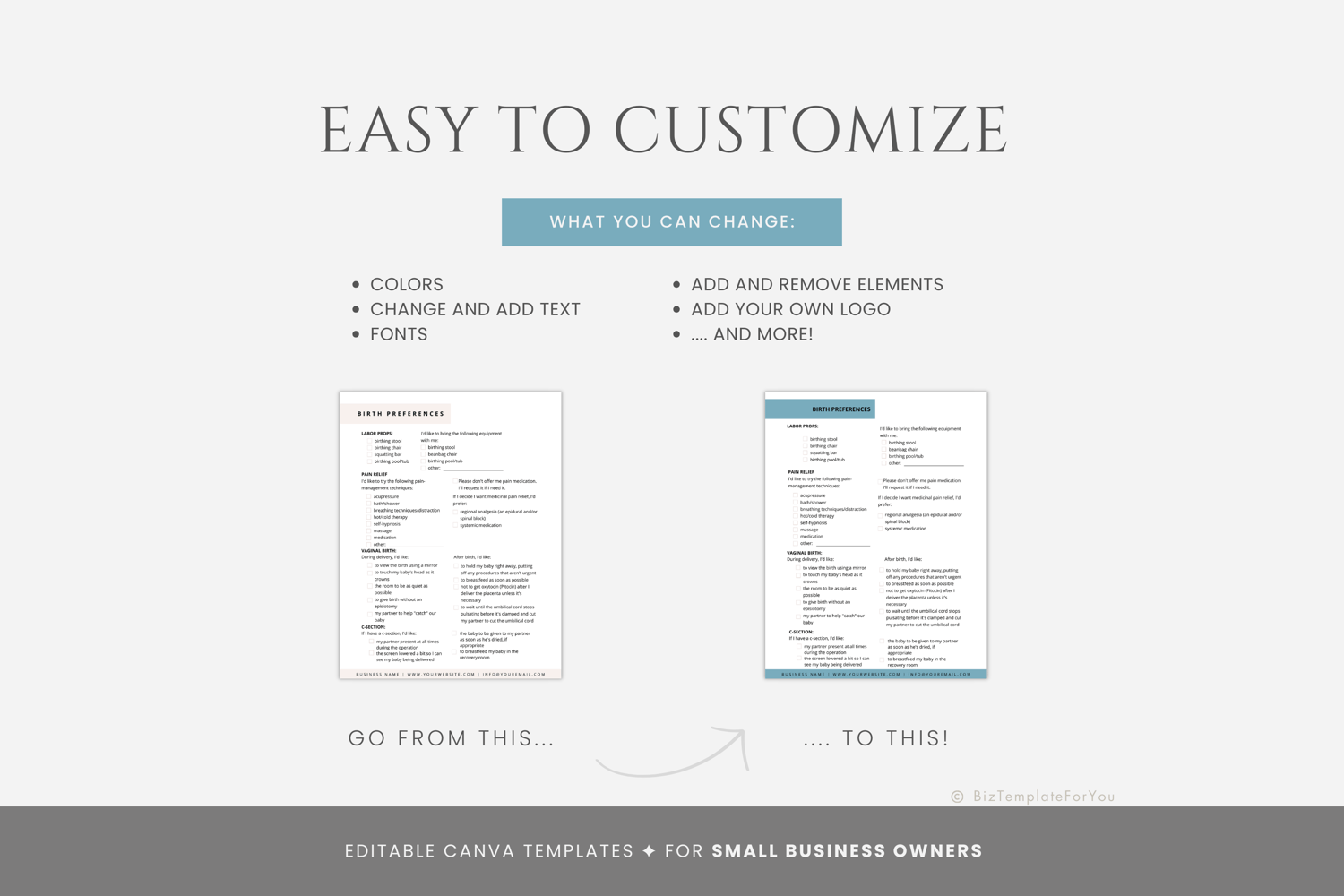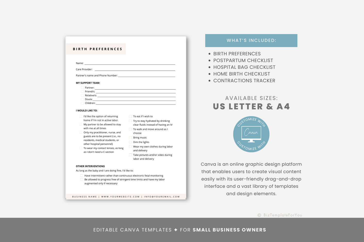 This is a 6-page Birth Preferences Checklists Bundle Template editable in Canva (FREE Account)! The text is already written for you, but it is also easily edited in CANVA to add anything particular to your business or area. It is also completely customizable. Text, font, and colors are all fully editable to give you complete control of your branding and create a cohesive look for your business.