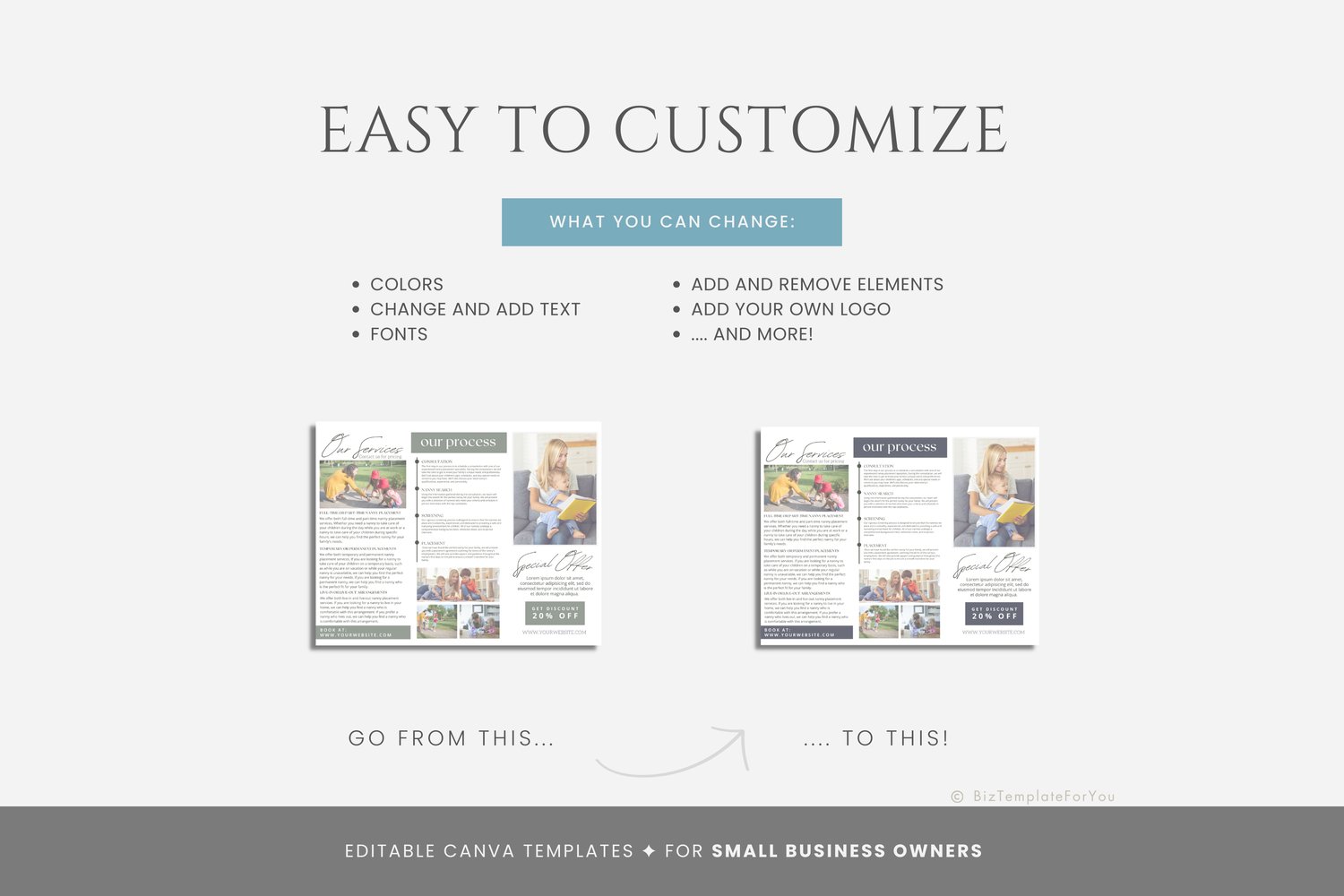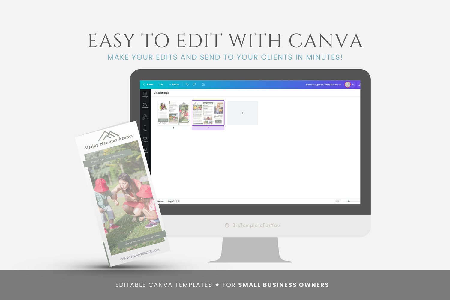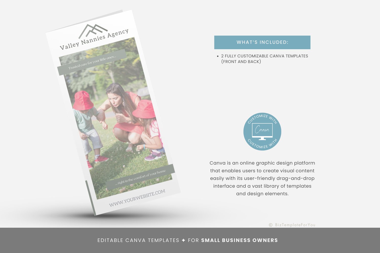 This is a 2-page Nannies Agency Trifold Brochure Template editable in Canva (FREE Account)! The text is already written for you, but it is also easily edited in CANVA to add anything that is particular to your business or area. It is also completely customizable. Text, font, and colors are all fully editable to give you complete control of your branding and create a cohesive look for your business.