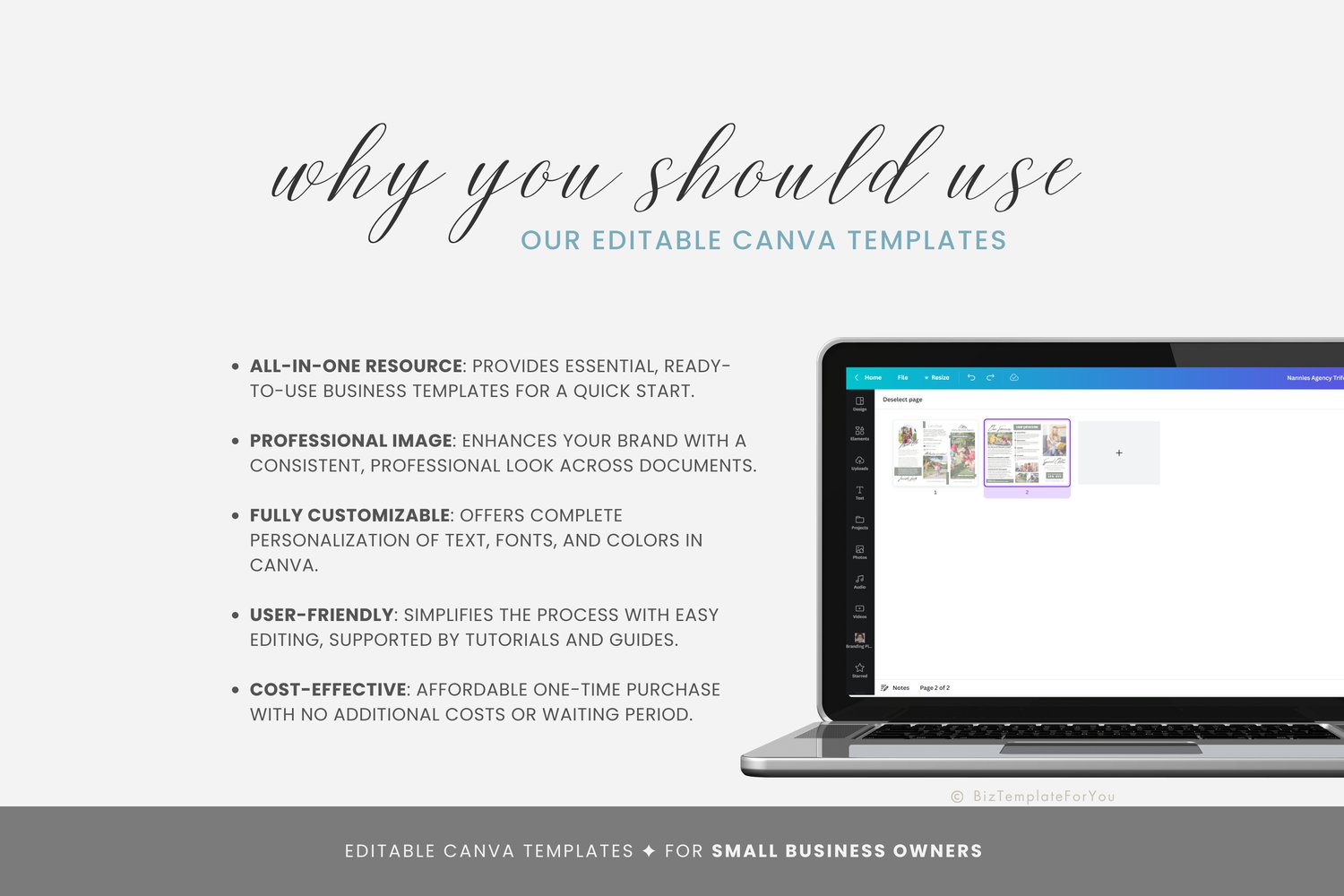 + All elements of our templates are FREE. BizTemplateForYou bears no responsibility for situations wherein the client utilizes PRO elements within Canva, resulting in charges incurred by Canva.