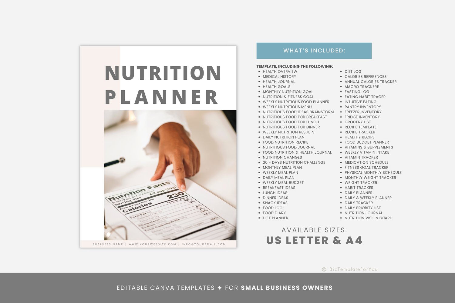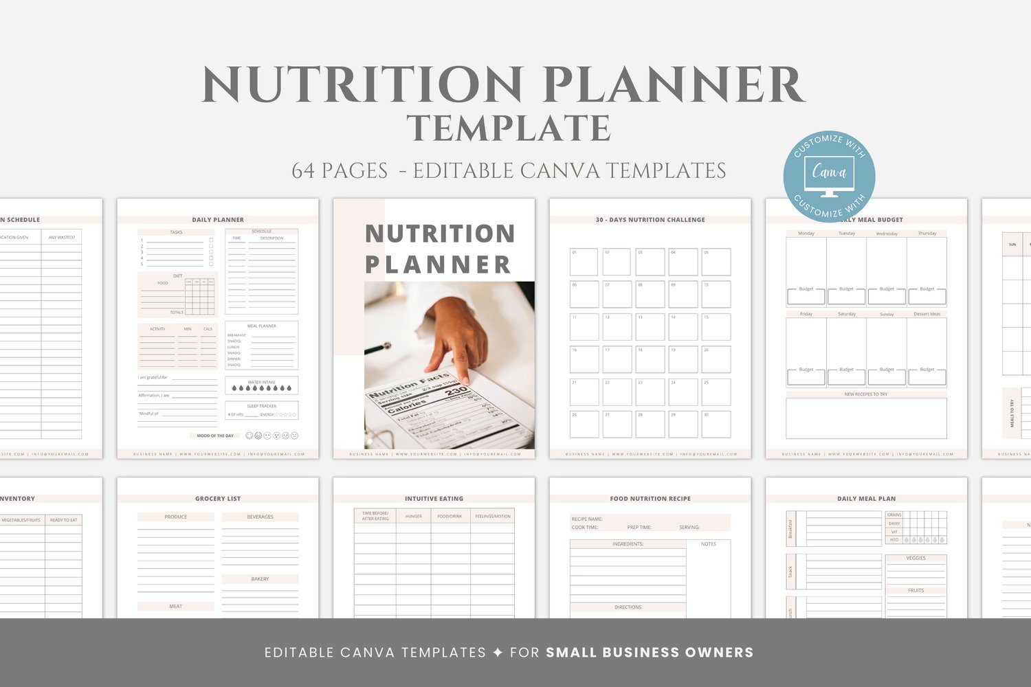 This is a 64-page Nutrition Planner Template editable in Canva (FREE Account)! The text is already written for you, but it can also be easily edited in CANVA to add anything particular to your business or area. It is also completely customizable. Text, font, and colors are all fully editable to give you complete control of your branding and create a cohesive look for your business.