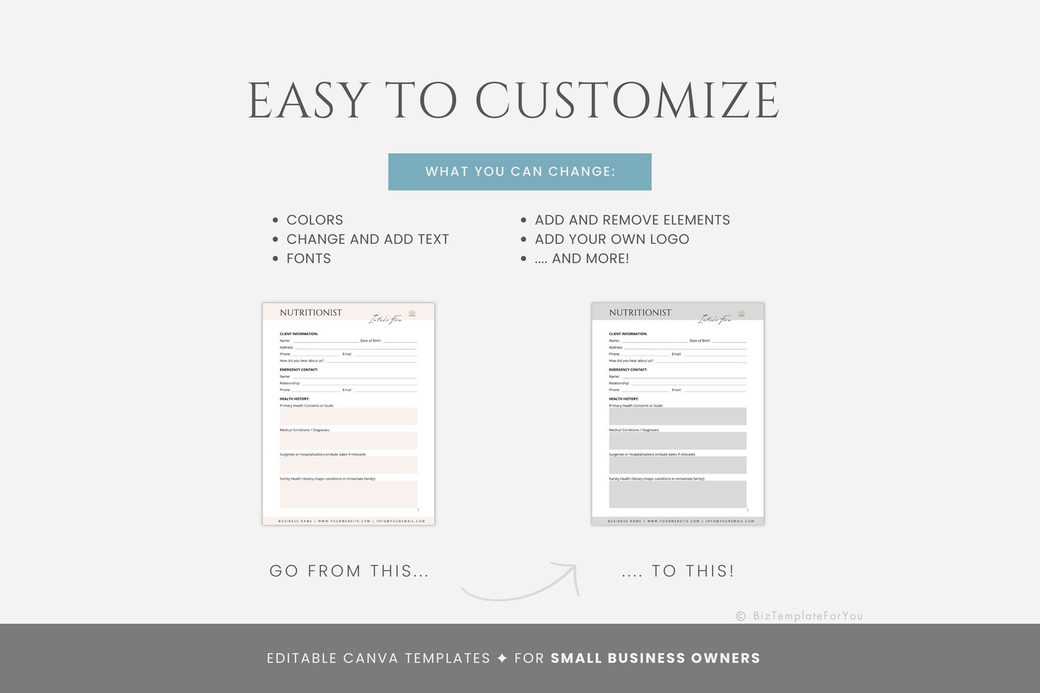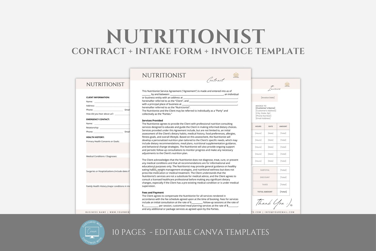 This is a 10-page Nutritionist Client Intake Form and Contract Template editable in Canva (FREE Account)! The text is already written for you, but it is also easily edited in CANVA to add anything that is particular to your business or area. It is also completely customizable. Text, font, and colors are all fully editable to give you complete control of your branding and create a cohesive look for your business.