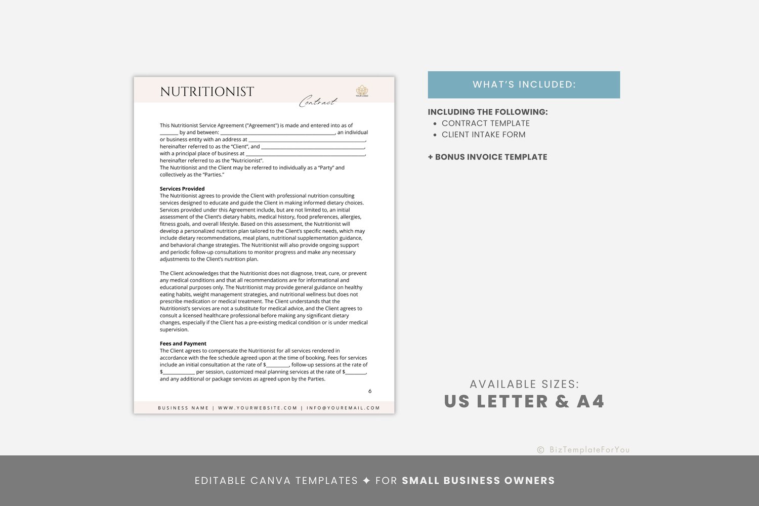 Editable Nutritionist Client Intake Form and Contract Template, Canva editable, Nutrition Consultant Forms, Nutritionist Service Agreement #7088