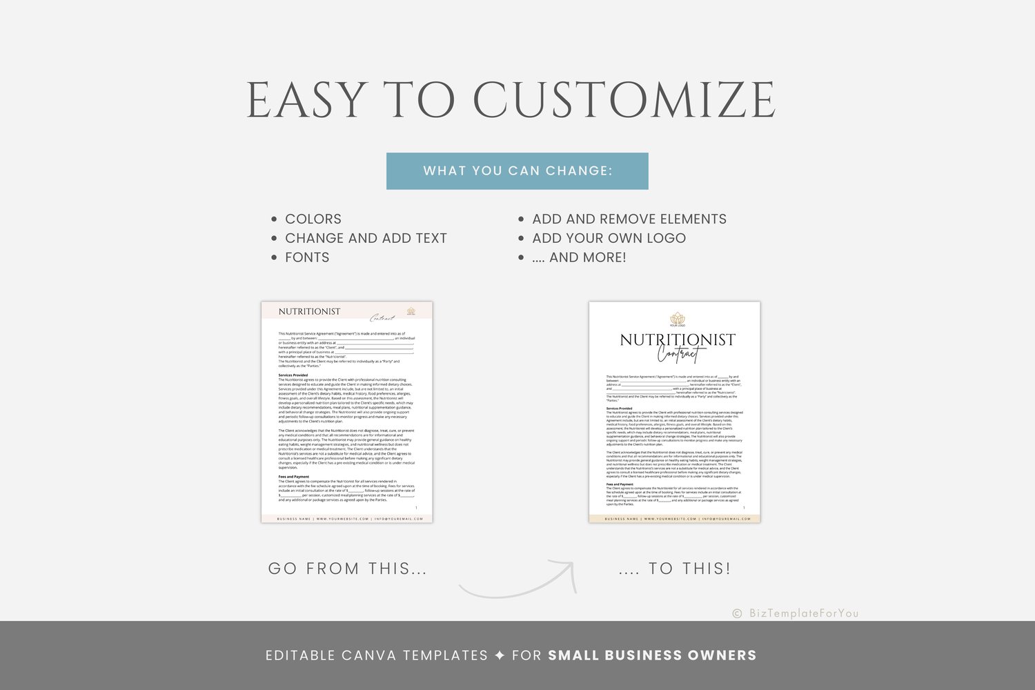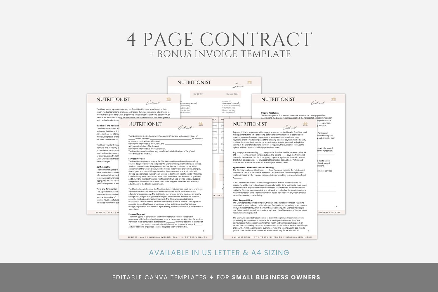 This is a 5-page Nutritionist Contract Template editable in Canva (FREE Account)! The text is already written for you, but it is also easily edited in CANVA to add anything that is particular to your business or area. It is also completely customizable. Text, font, and colors are all fully editable to give you complete control of your branding and create a cohesive look for your business.