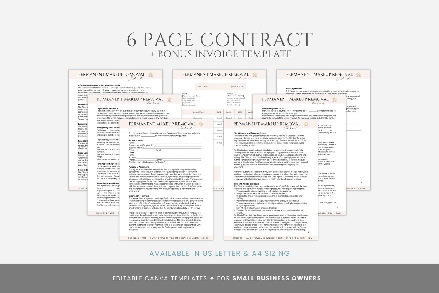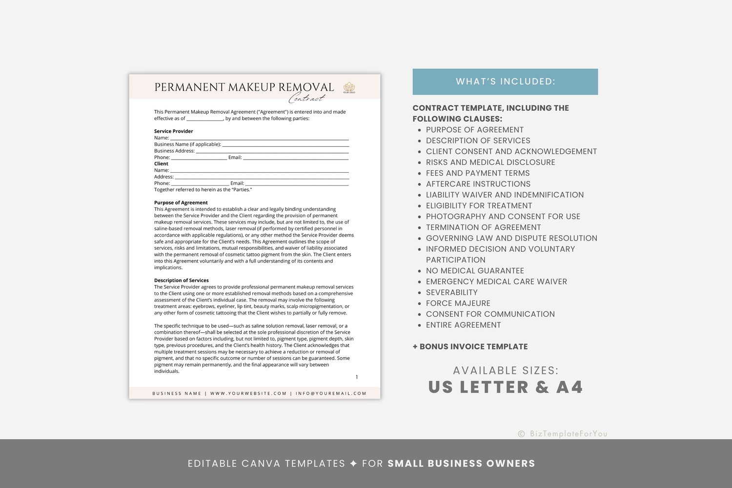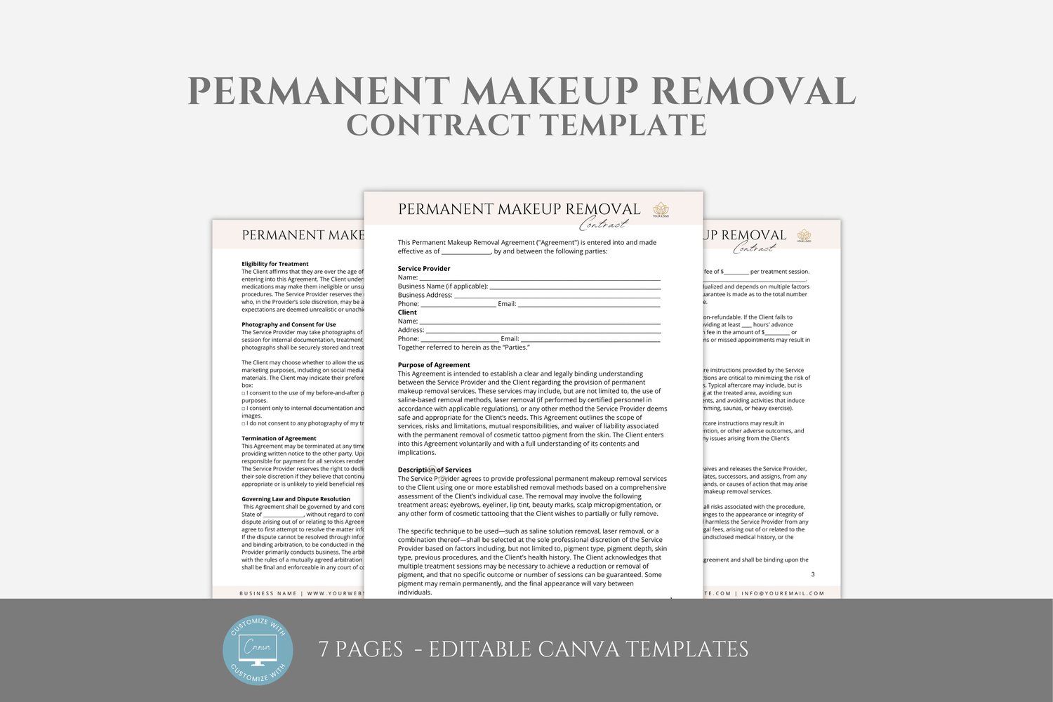 Editable Permanent Makeup Removal Contract Template, PMU Removal Service Agreement, Microblading Removal Service Contract, Canva editable #7097