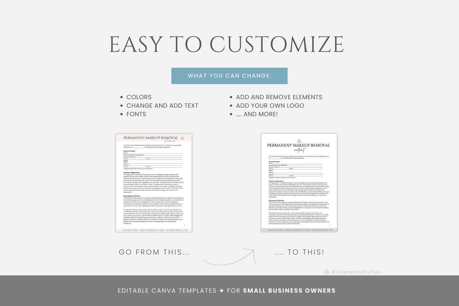 This is a 7-page Permanent Makeup Removal Contract Template editable in Canva (FREE Account)! The text is already written for you, but it can also be easily edited in CANVA to add anything particular to your business or area. It is also completely customizable. Text, font, and colors are all fully editable to give you complete control of your branding and create a cohesive look for your business.