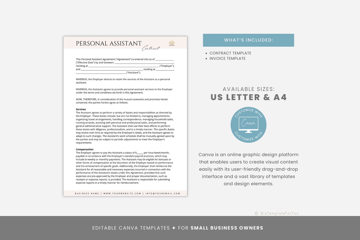 Editable Personal Assistant Contract Template, Freelance Personal Assistant Agreement, incl. Non-Disclosure and Invoice Template, Canva Template #6048