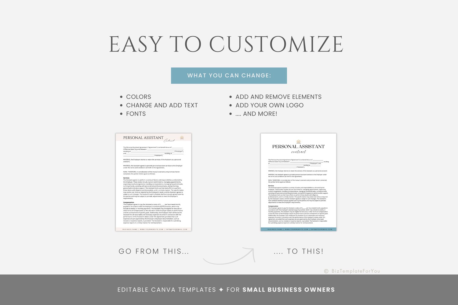 This is a 5-page Personal Assistant Contract Template editable in Canva (FREE Account)! The text is already written for you, but it is also easily edited in CANVA to add anything particular to your business or area. It is also completely customizable. Text, font, and colors are all fully editable to give you complete control of your branding and create a cohesive look for your business.