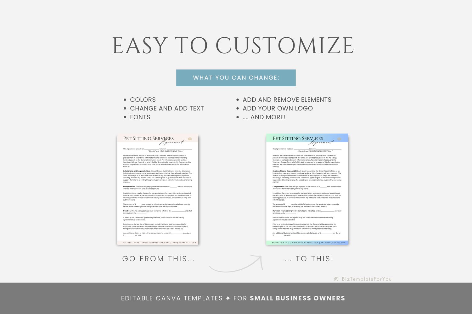 This is a 7-page Editable Pet Sitting Contract Template editable in Canva (FREE Account)! The text is already written for you, but it is also easily edited in CANVA to add anything that is particular to your business or area. It is also completely customizable. Text, font, and colors are all fully editable to give you complete control of your branding and create a cohesive look for your business.