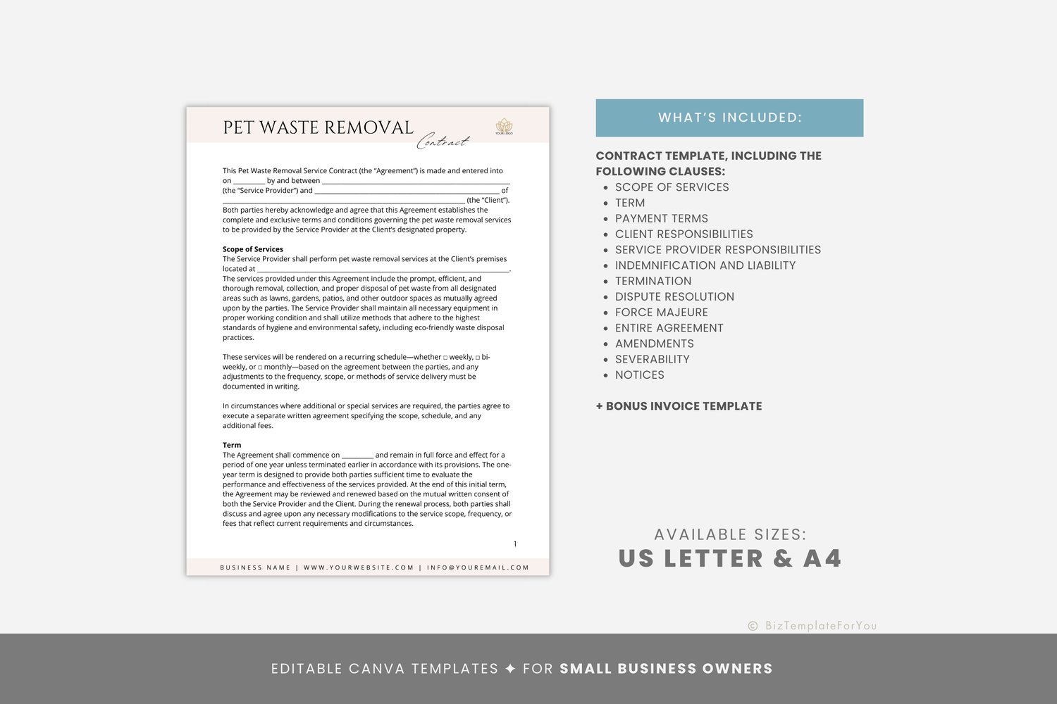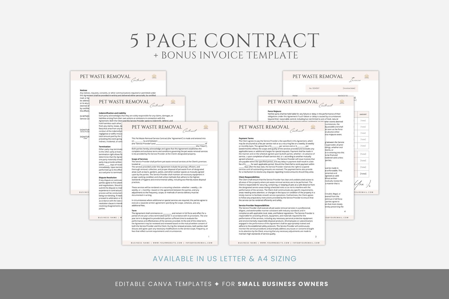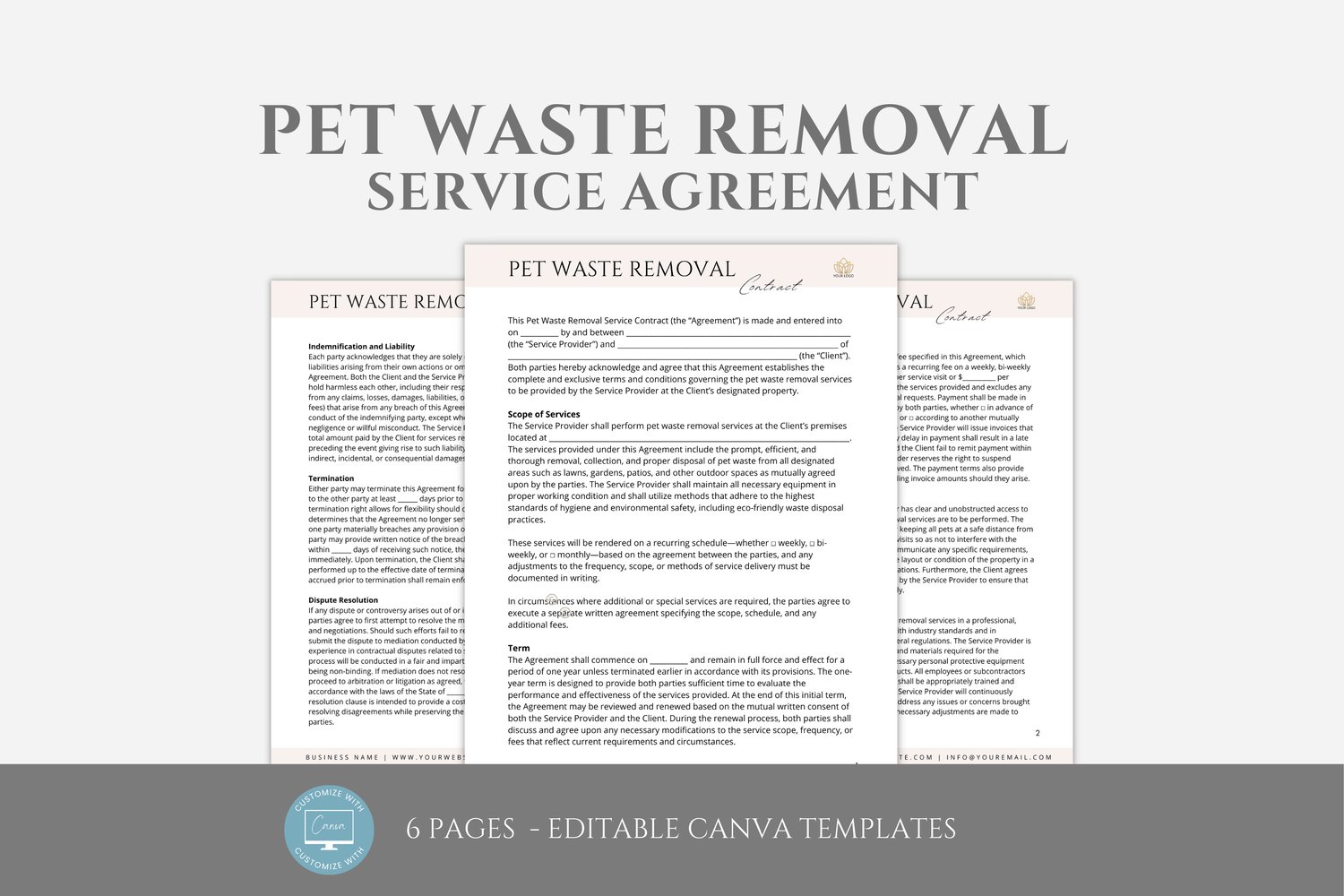 Editable Pet Waste Removal Service Contract Template, Poop Scooper Service Agreement, Dog Waste Removal, Professional Service, Canva files #7089