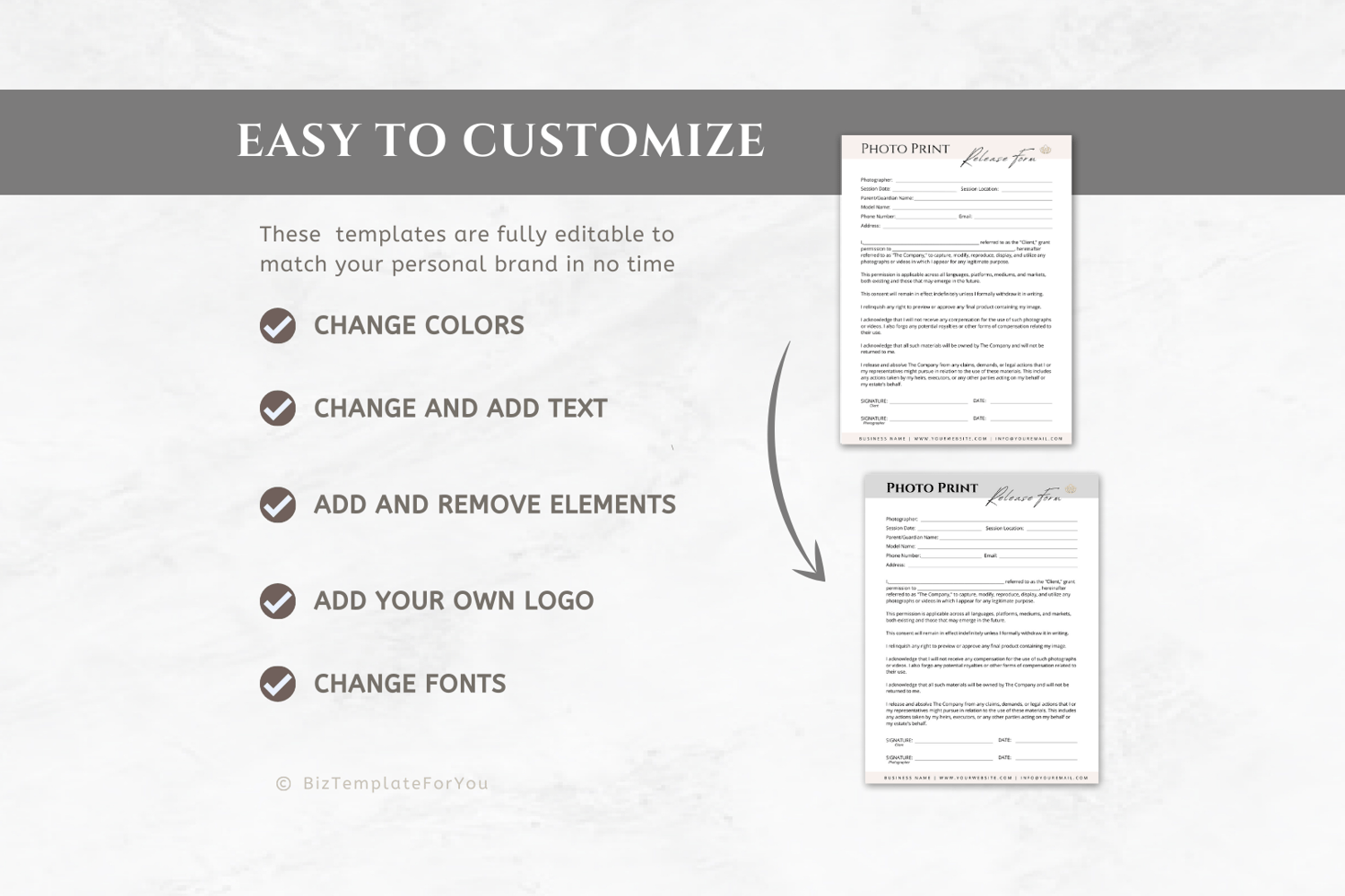 This is a 1-page Photo Print Release Form Template for Photographers editable in Canva (FREE Account)! The text is already written for you, but it is also easily edited in CANVA to add anything that is particular to your business or area. It is also completely customizable. Text, font, and colors are all fully editable to give you complete control of your branding and create a cohesive look for your business.