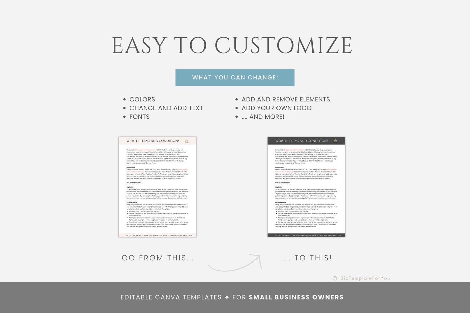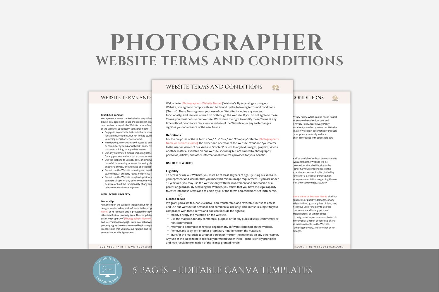 This is a 5-page Photographer Website Terms and Conditions Template editable in Canva (FREE Account)! The text is already written for you, but it can also be easily edited in CANVA to add anything particular to your business or area. It is also completely customizable. Text, font, and colors are all fully editable to give you complete control of your branding and create a cohesive look for your business.